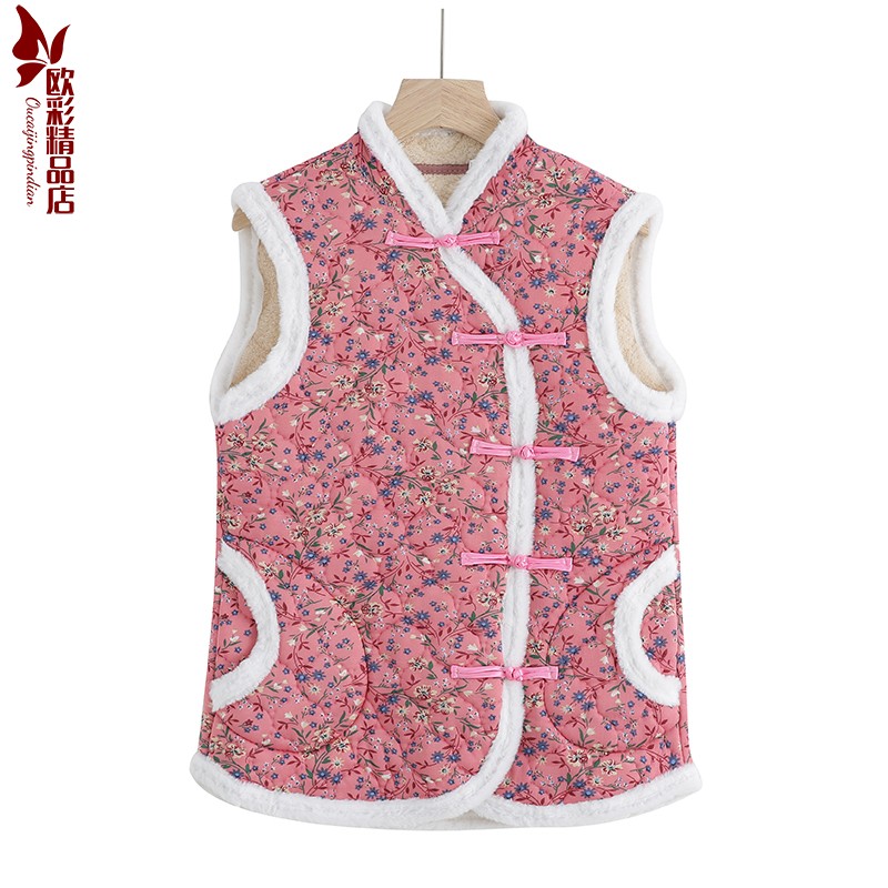 民族风东北大花马甲秋冬装斜襟保暖加绒加厚中年女装碎花旗袍坎肩