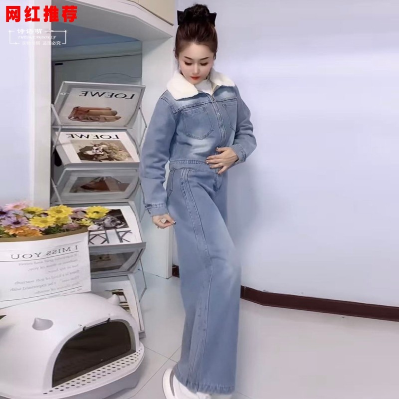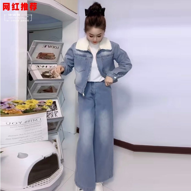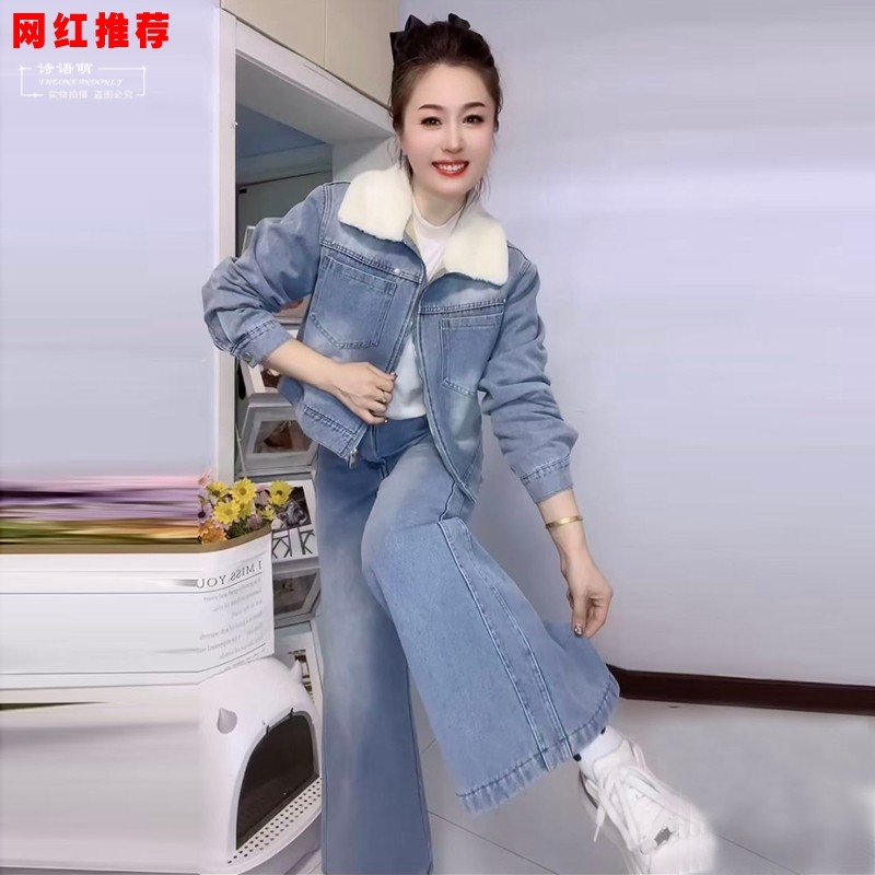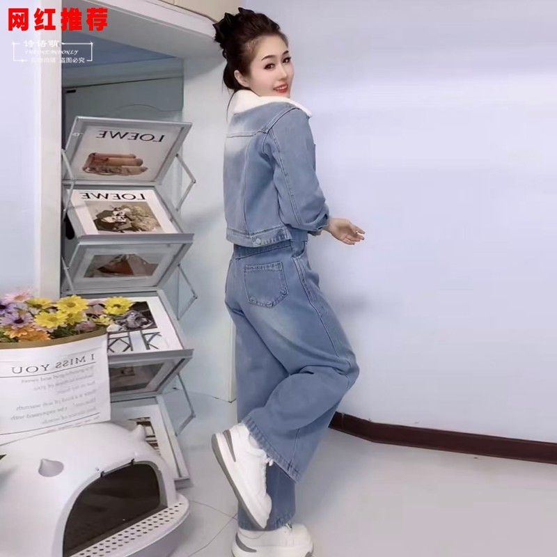 洋气时尚套装女冬季新款加绒牛仔短外套+韩版显瘦休闲长裤两件套