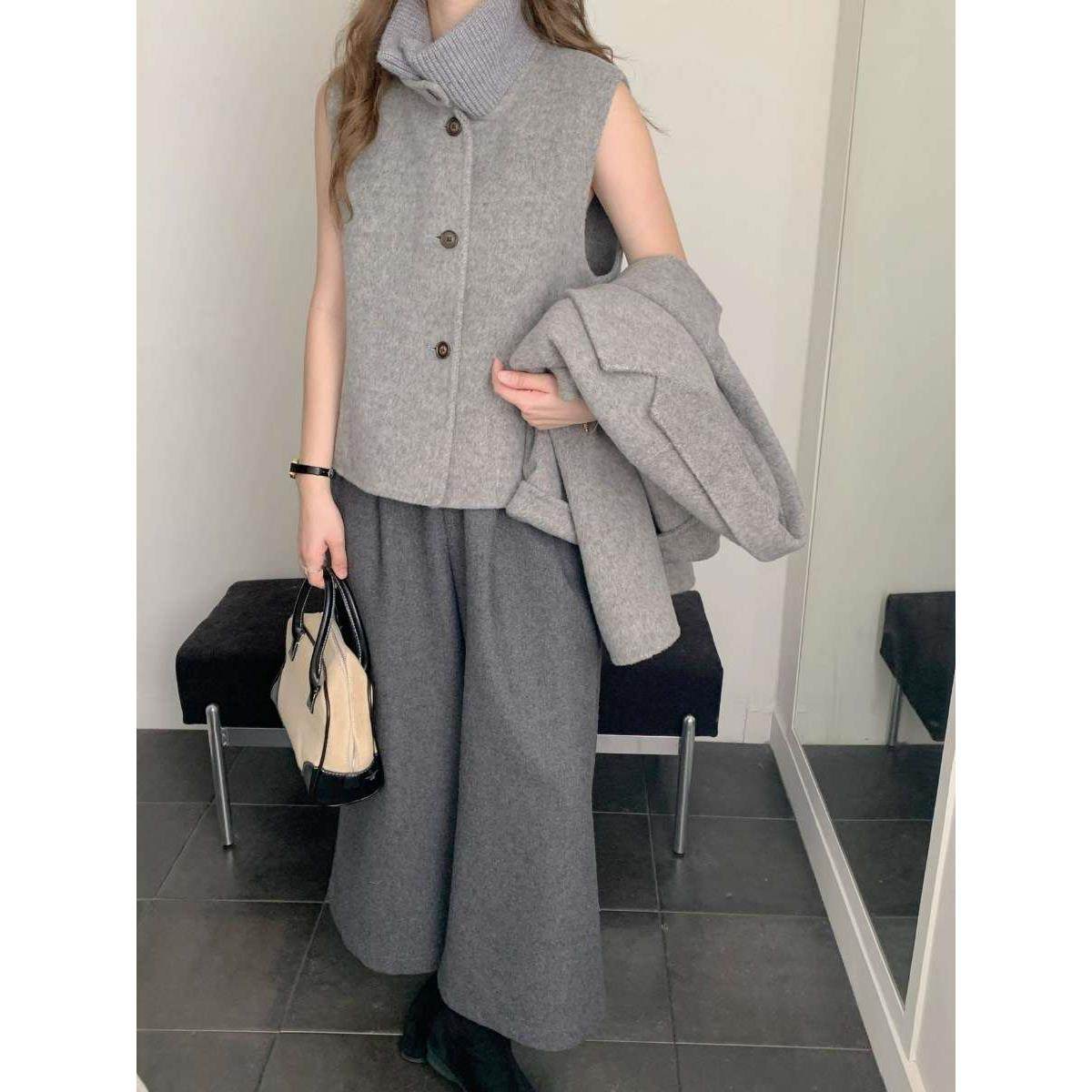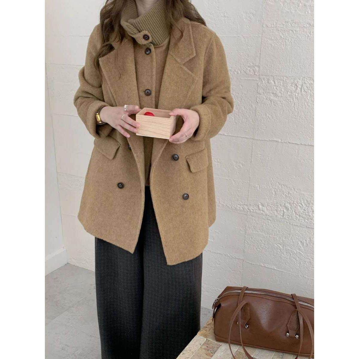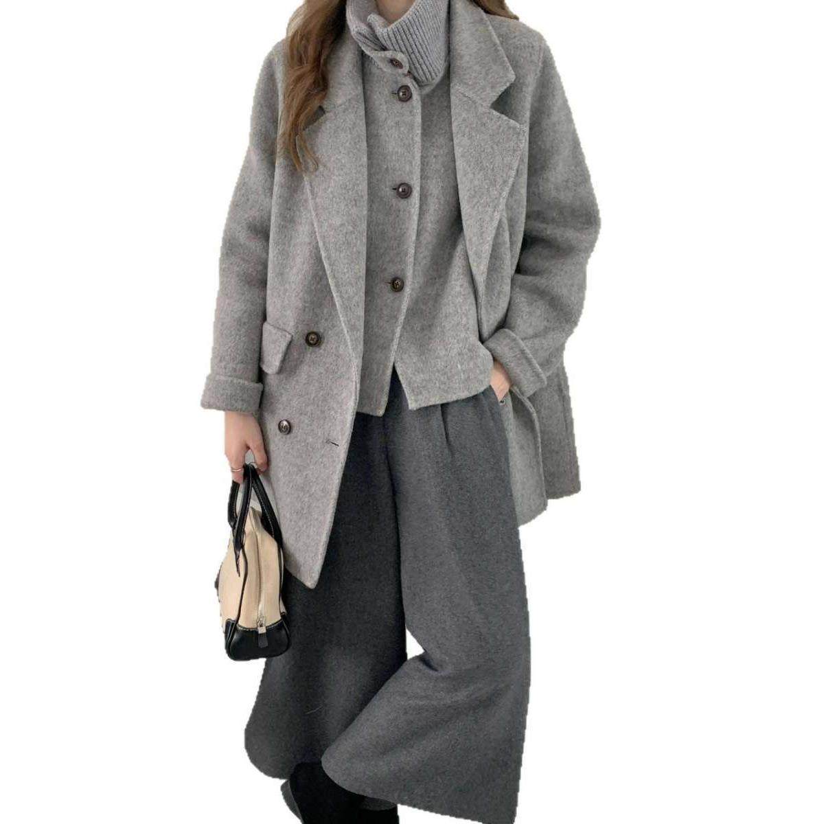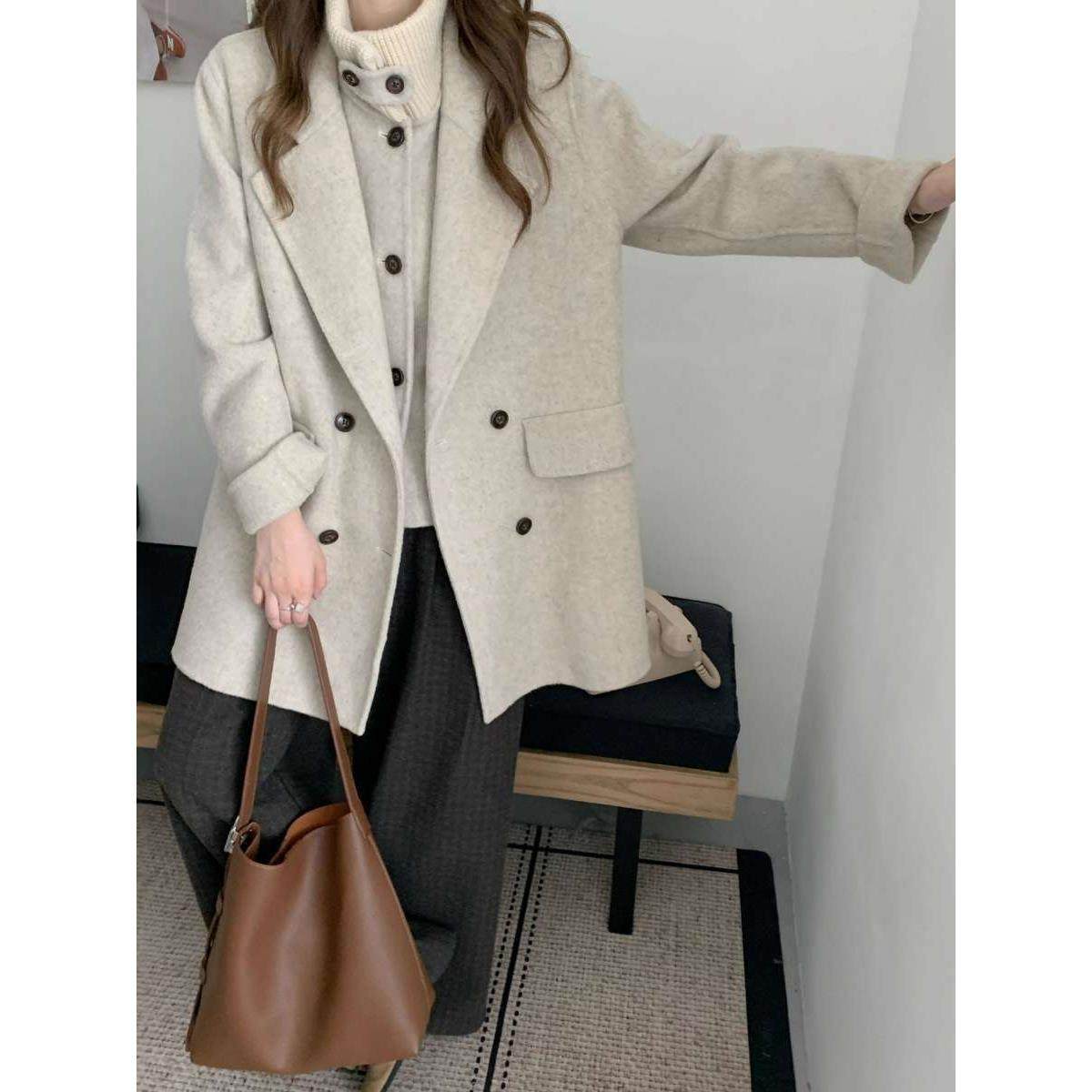 西装针织领双面呢大衣女中长款加厚宽松双排扣秋冬通勤毛呢外套