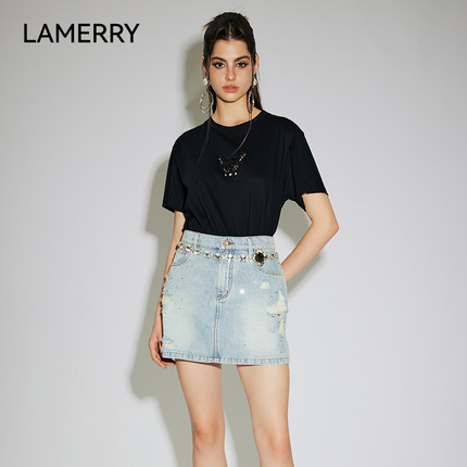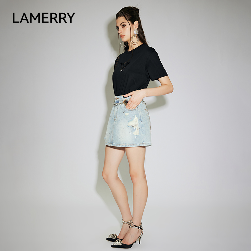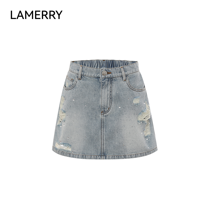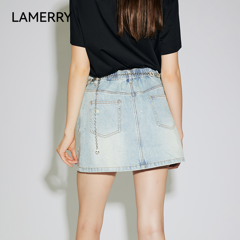 LAMERRY/朗美睿牛仔A字半身裙短裙镂空毛边时尚百搭2025春夏新品