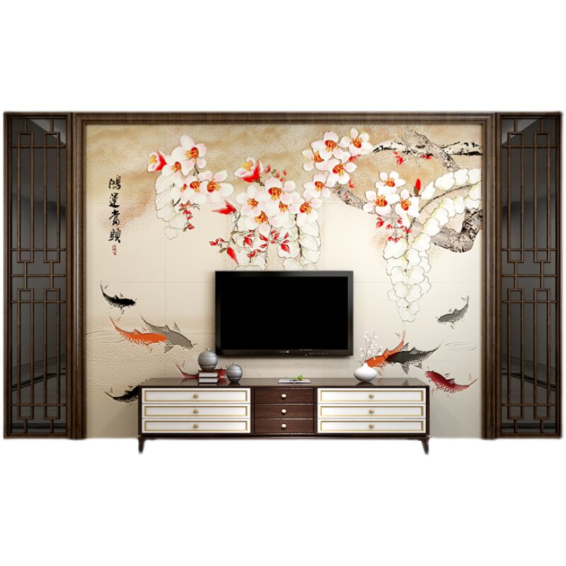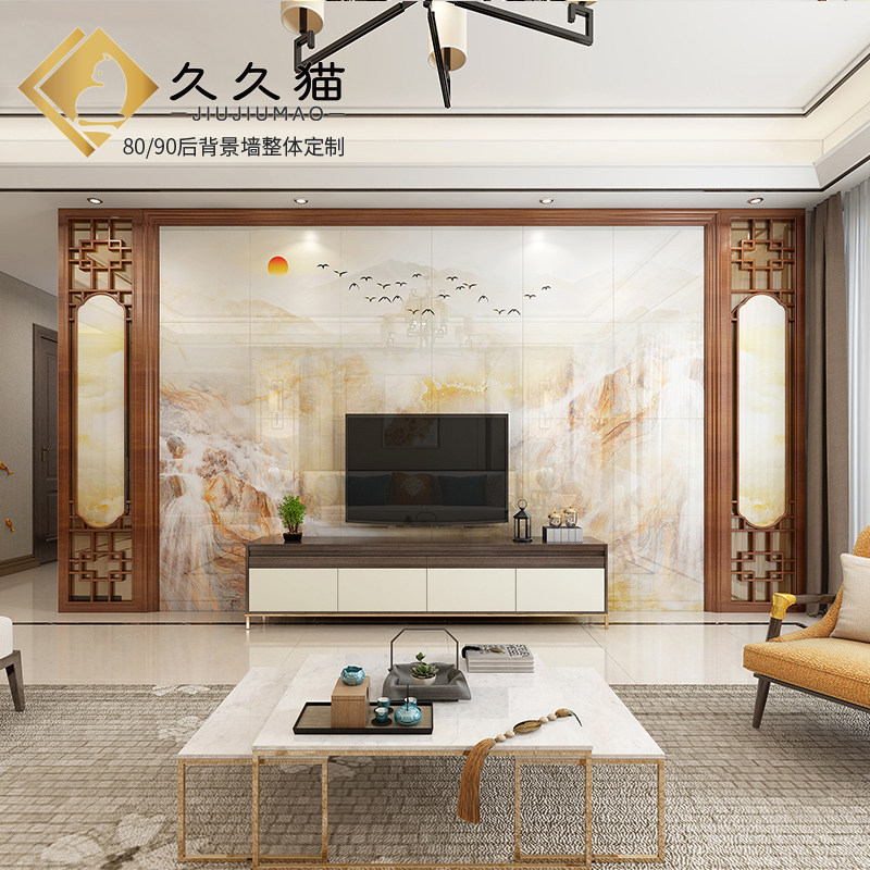 客厅电视墙实木花格红檀木色瓷砖背景墙原木造型大理石护墙板