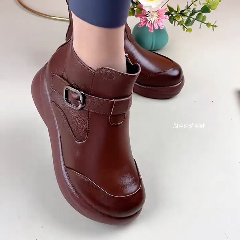 真皮短靴女2025秋冬新款牛皮圆头松糕厚底加绒女靴马丁靴妈妈鞋子