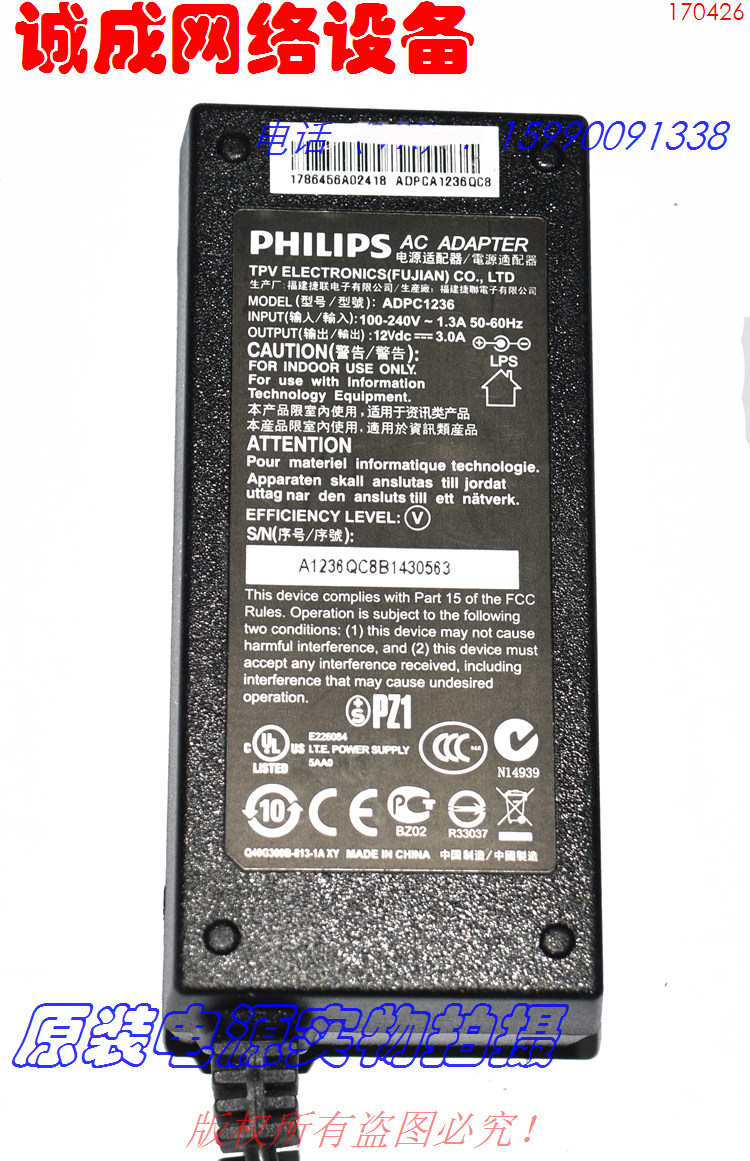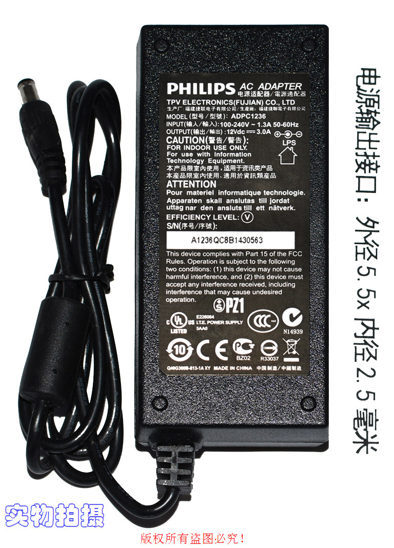原装PHILIPS飞利浦12Vdc3.0A/3.75A 显示器电源适配器ADPC1236
