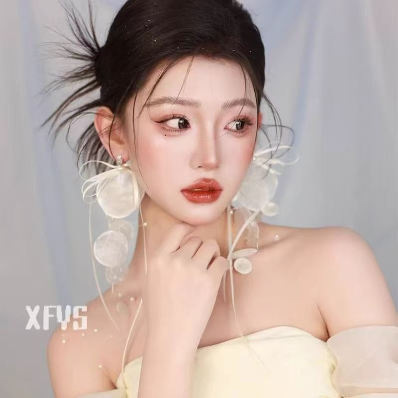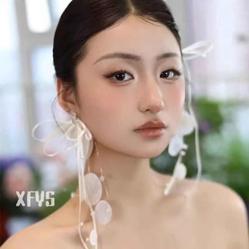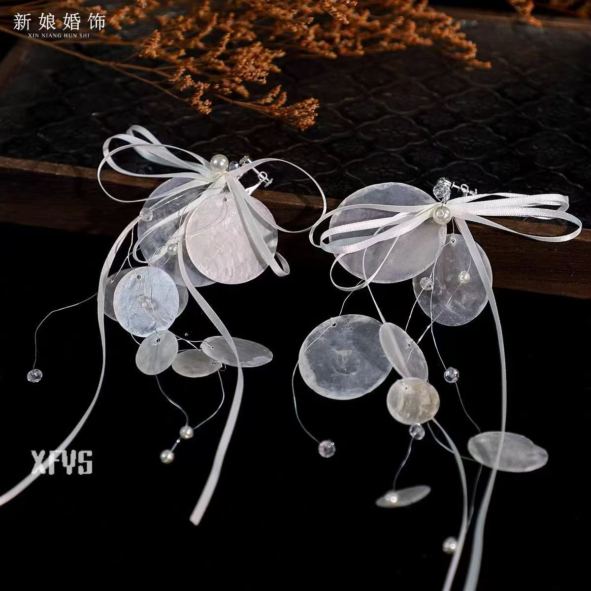 新款法式复古圆片蝴蝶结流苏耳环新娘长款耳钉结婚纱礼服耳饰
