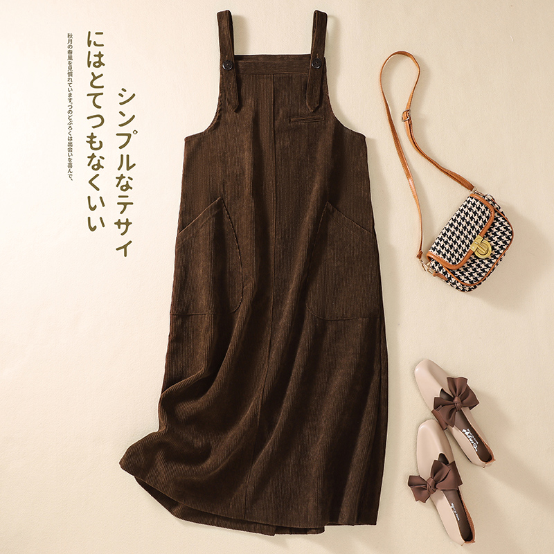 大码女装秋季胖MM复古灯芯绒背带裙女中长款宽松大口袋无袖连衣裙