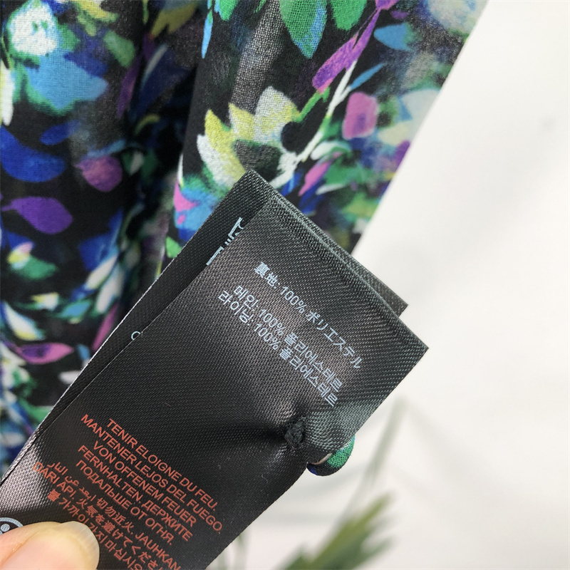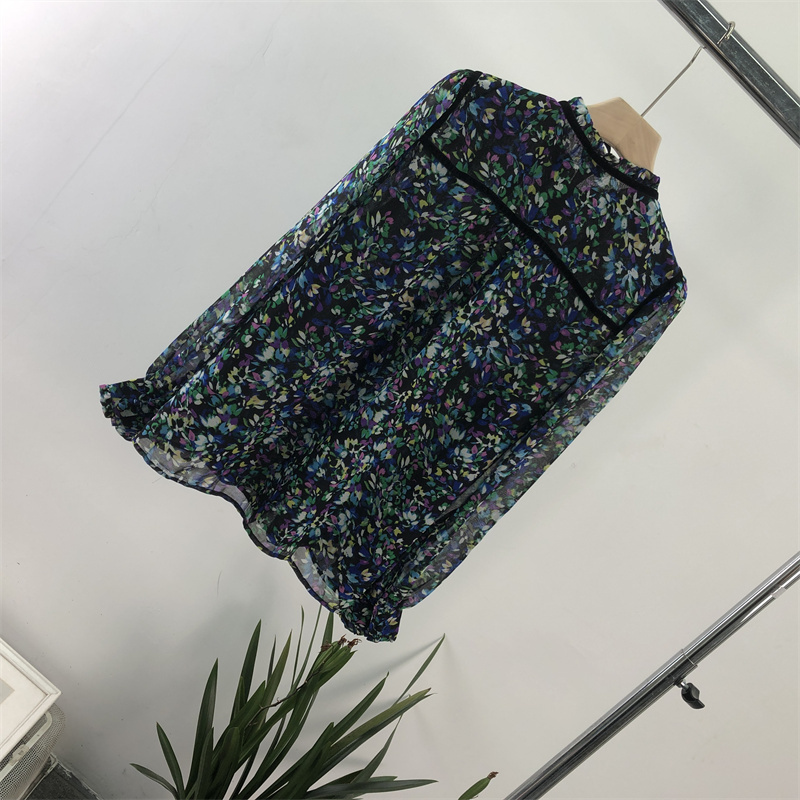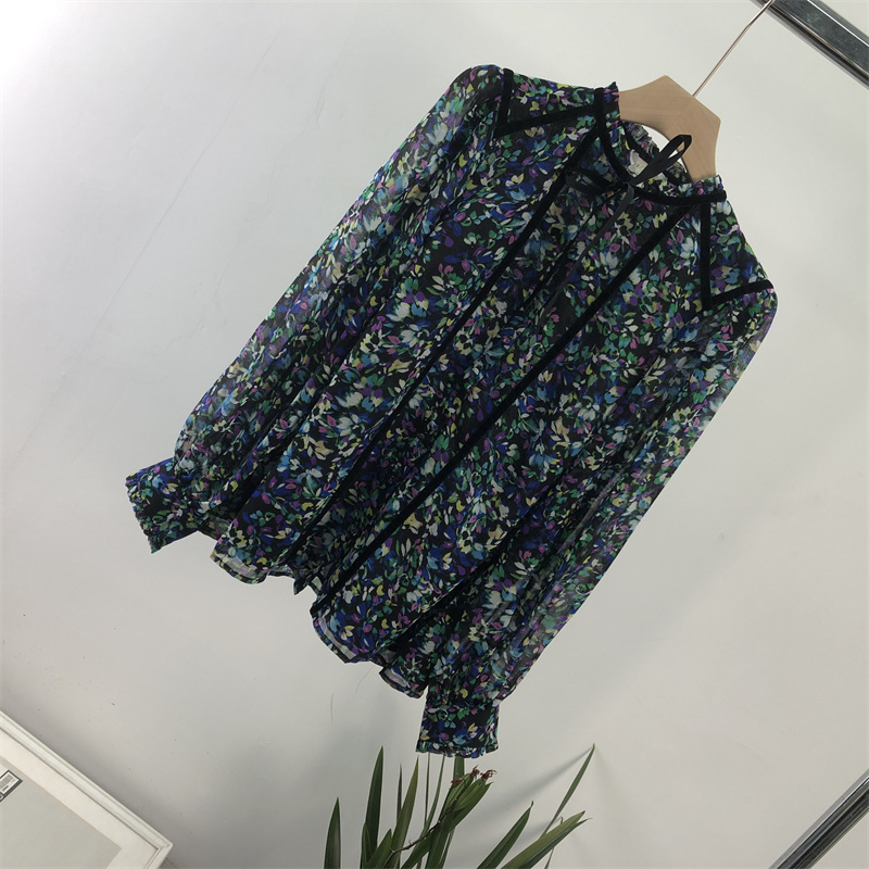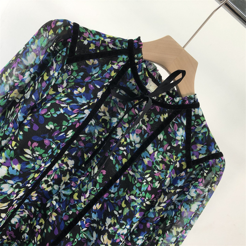 外贸欧美 春秋季黑色丝绒条装饰绿色小碎花大码衬衫上衣