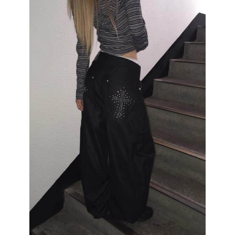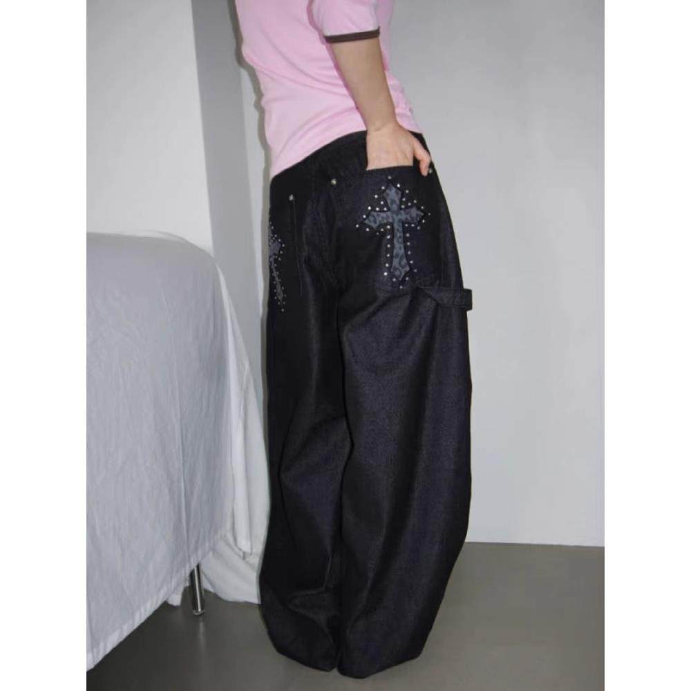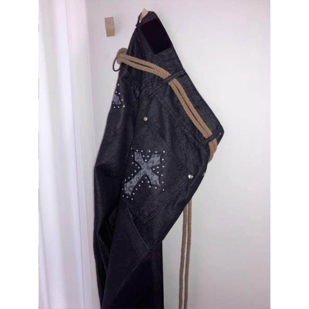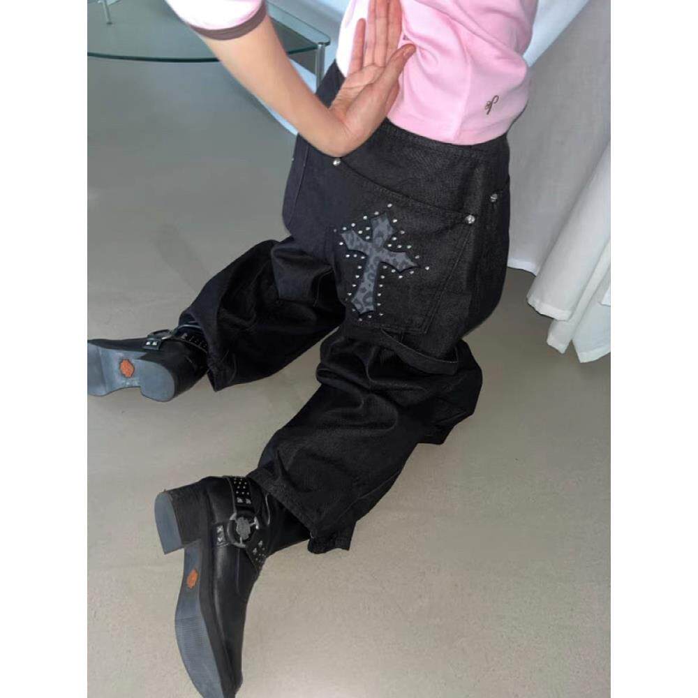 美式复古豹纹十字架弯刀牛仔裤女春秋款高街设计感宽松显瘦阔腿裤