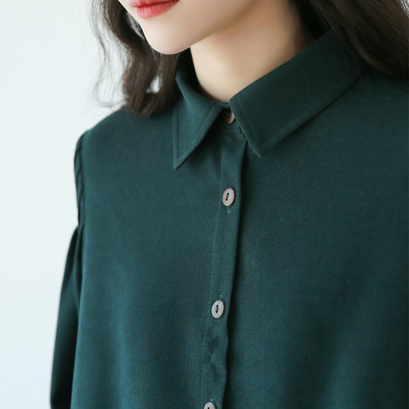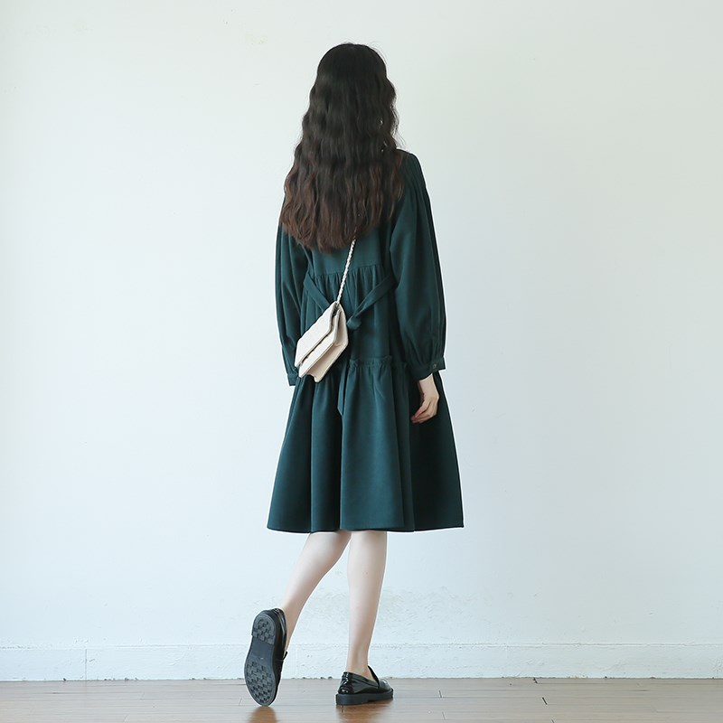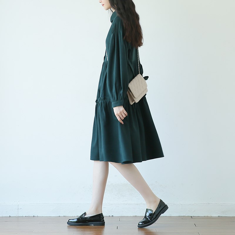 suin2024春秋新款文艺学院风宽松大码系带绿色衬衫领长袖连衣裙女