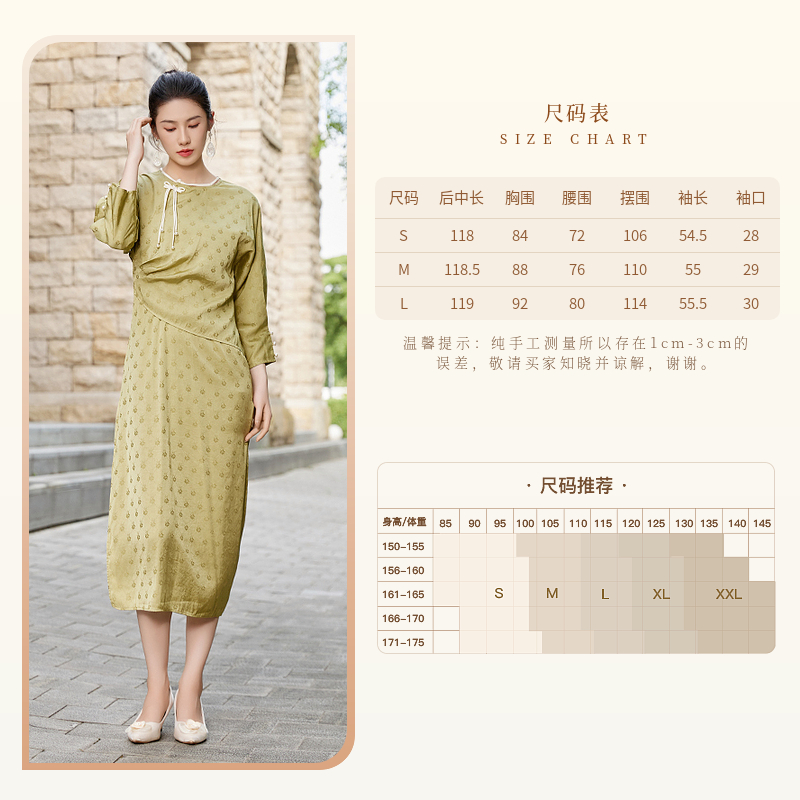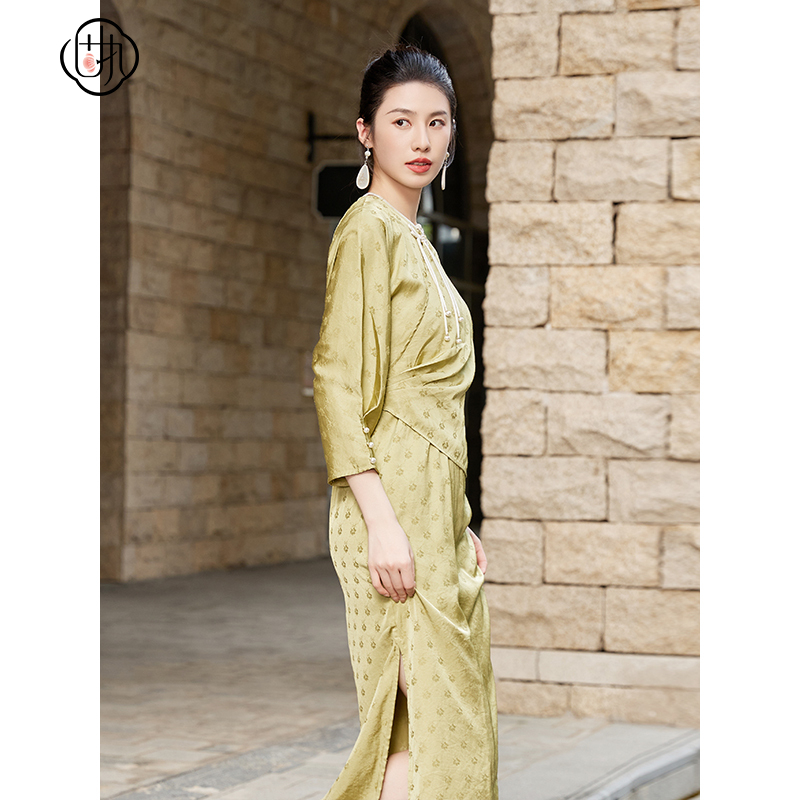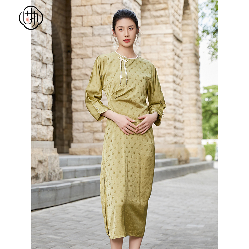 固执秋季新款新中式圆领提花假两件中长款连衣裙40033LQ08271