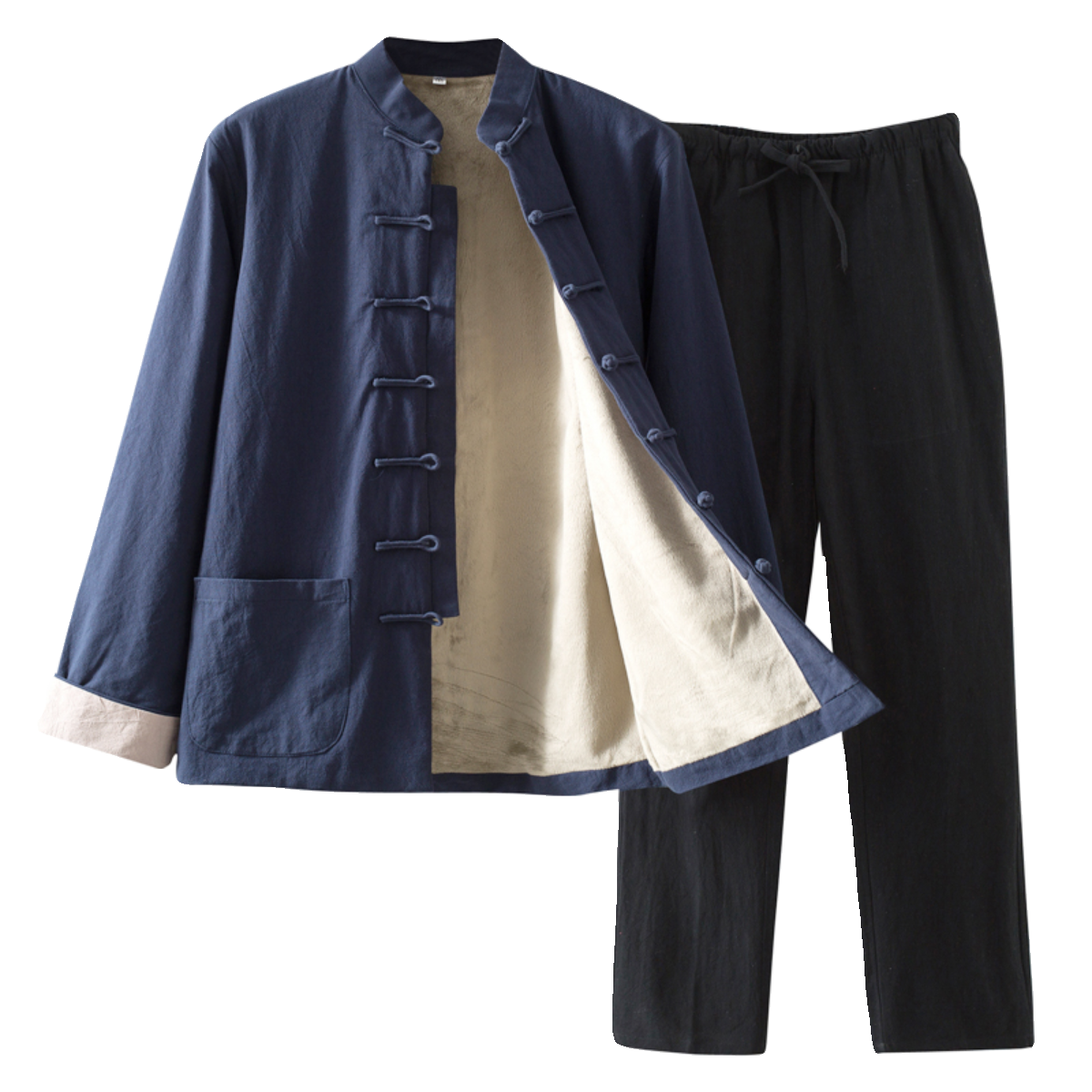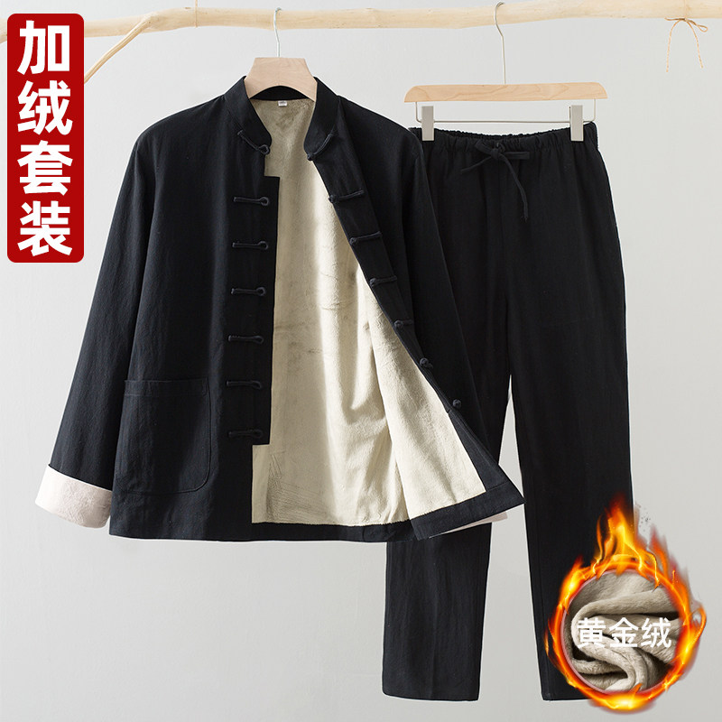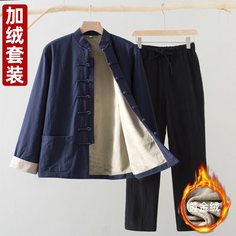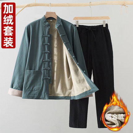 唐装男加绒加厚中老年秋冬季保暖套装中国风中式复古盘扣外套棉衣