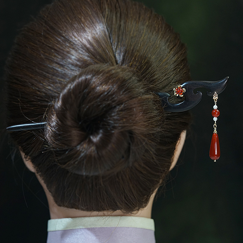 古风宫廷流苏红玛瑙黑檀木簪汉服