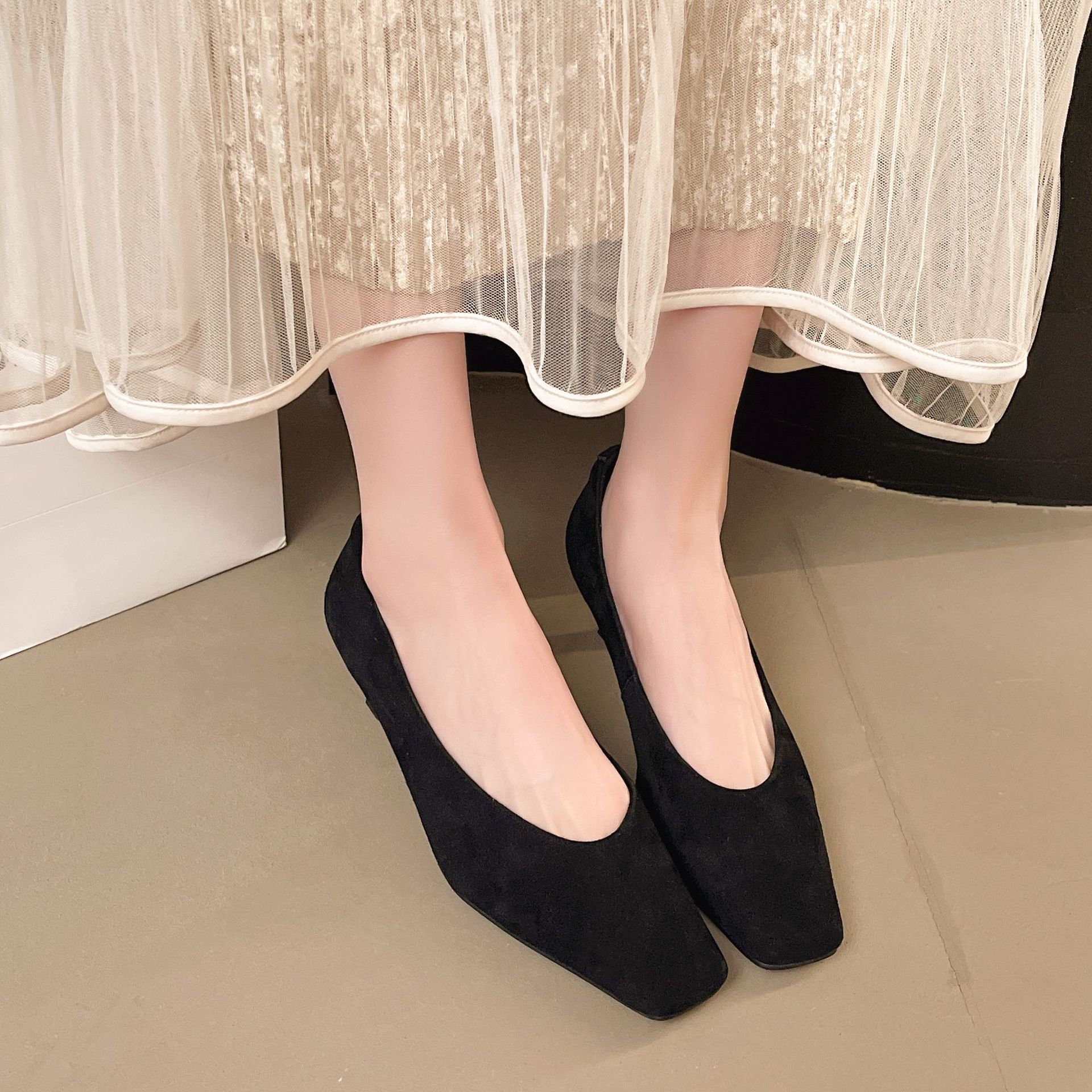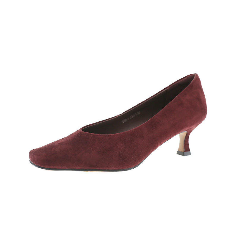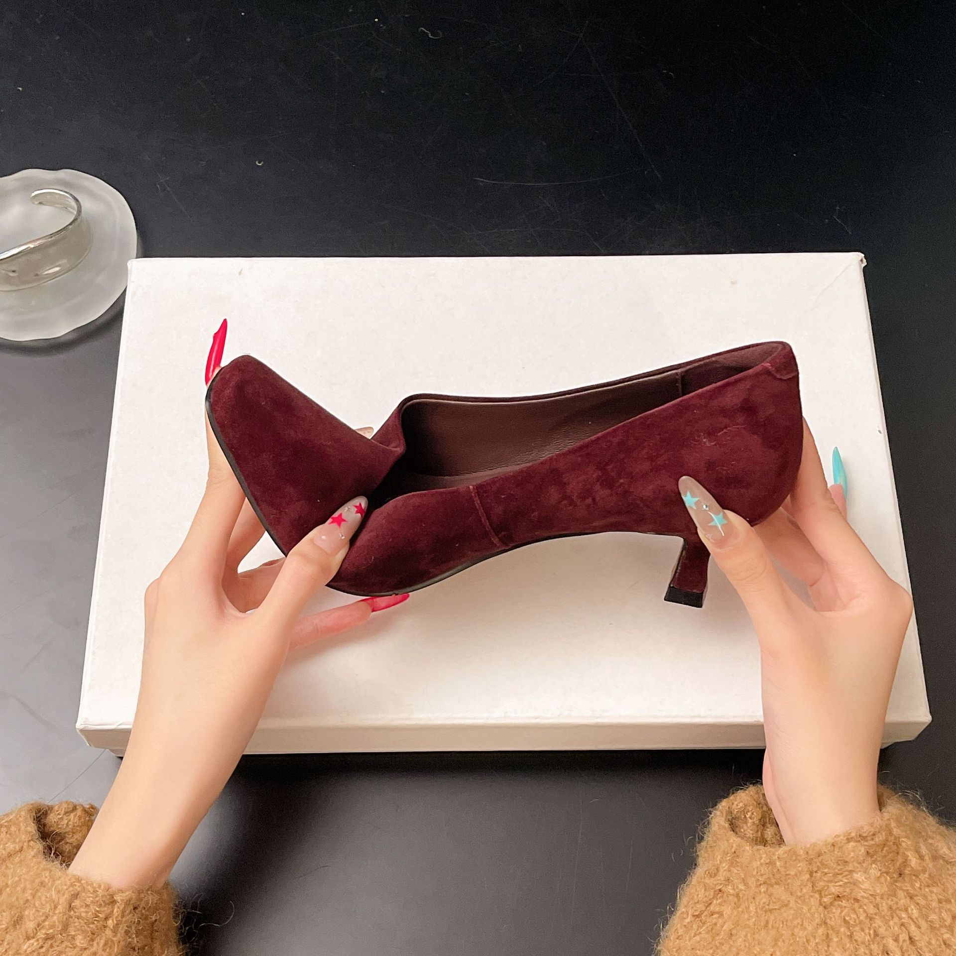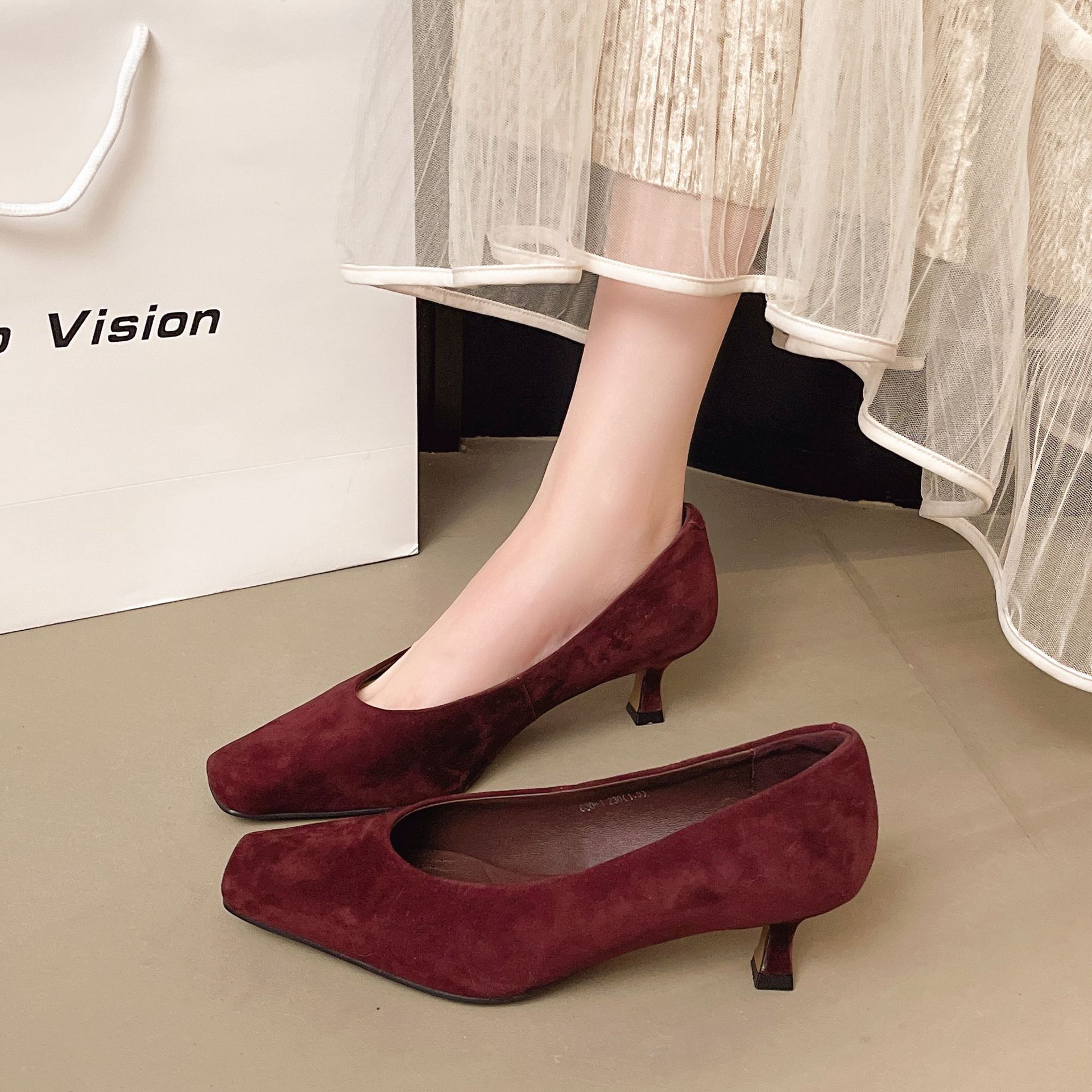 羊猄皮红色高跟鞋女细跟2025秋季新款法式方头低跟不累脚浅口单鞋