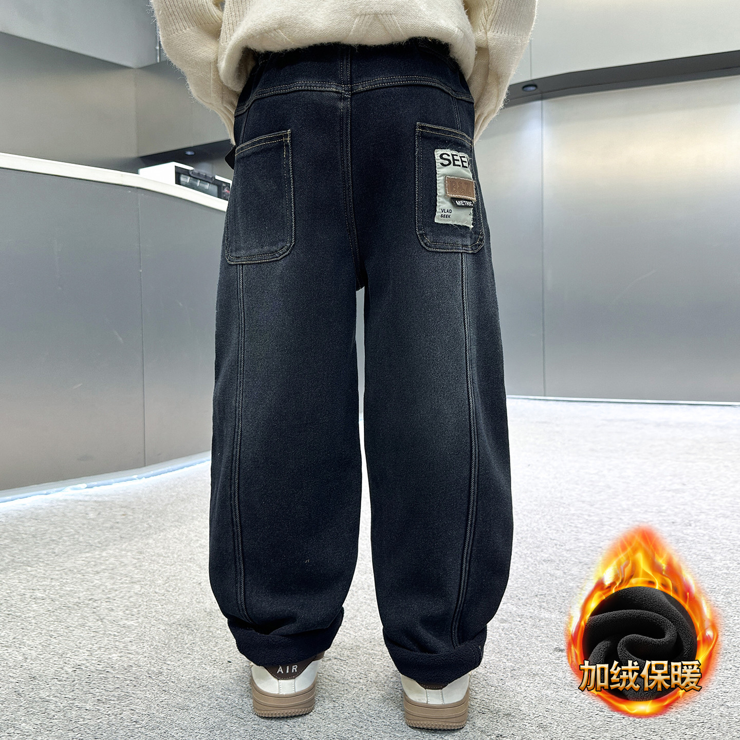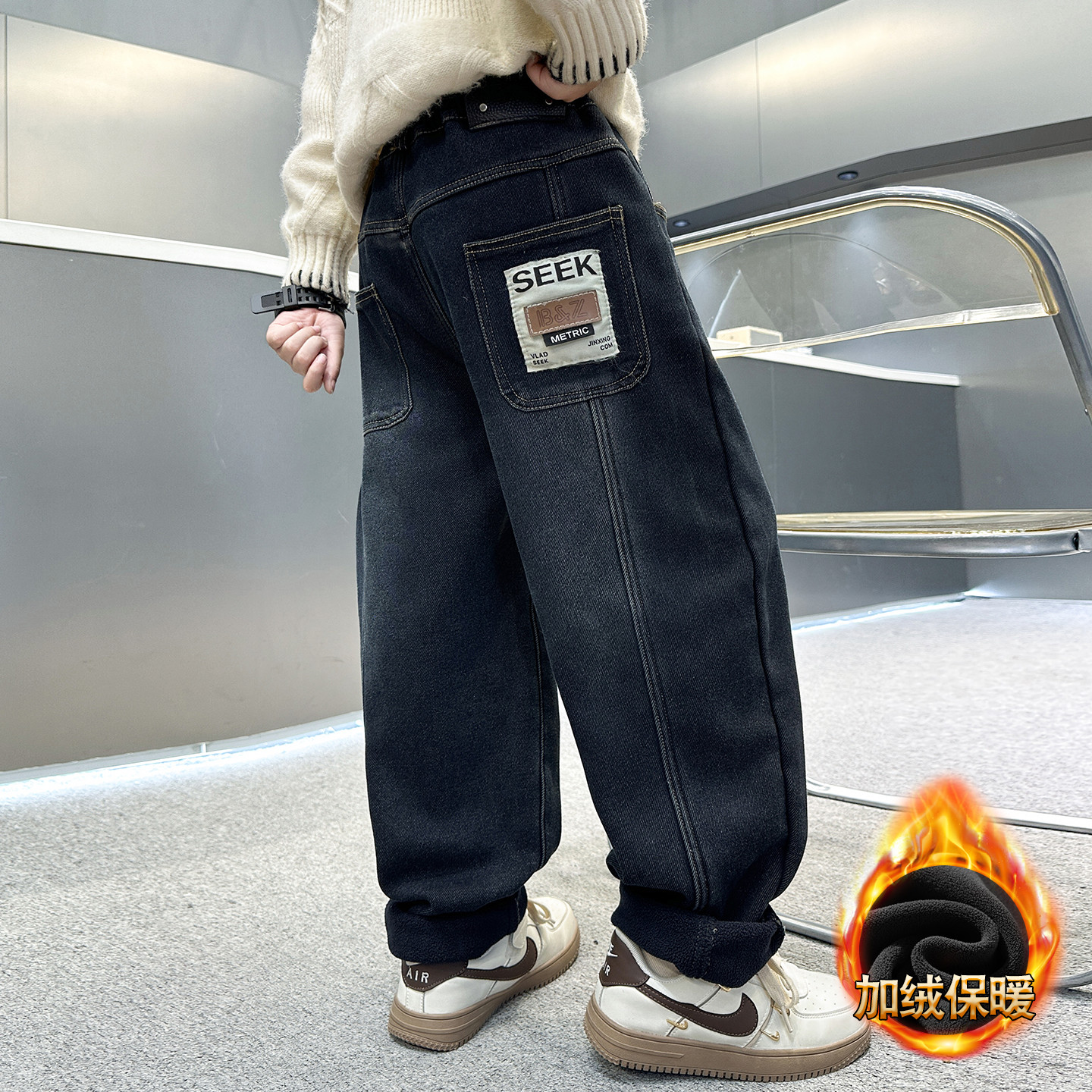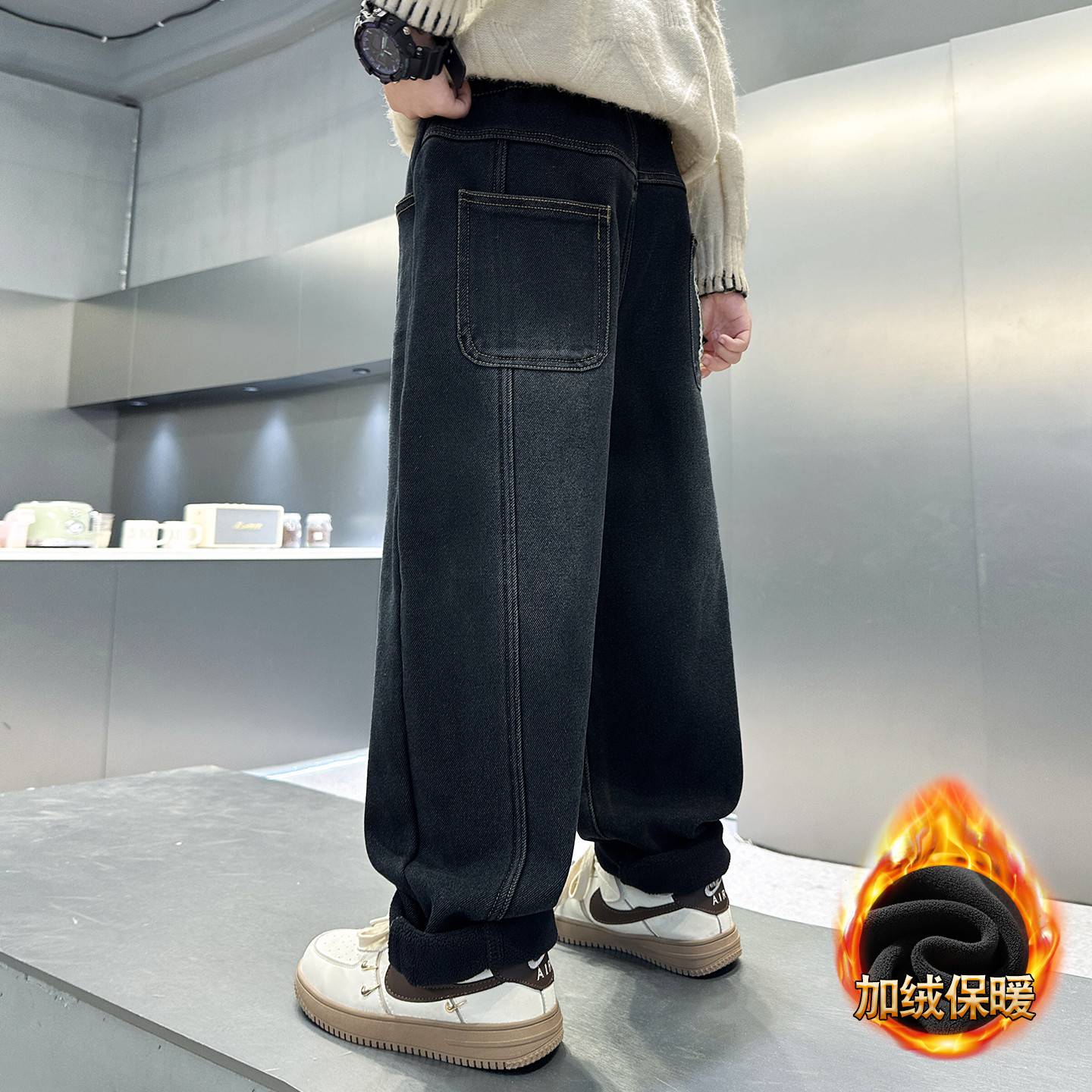 男童秋冬加绒牛仔裤韩版裤子2025新款中大童男孩加厚一体绒休闲裤