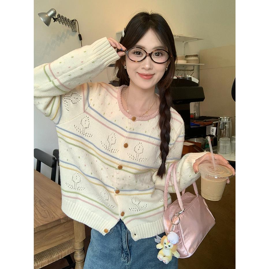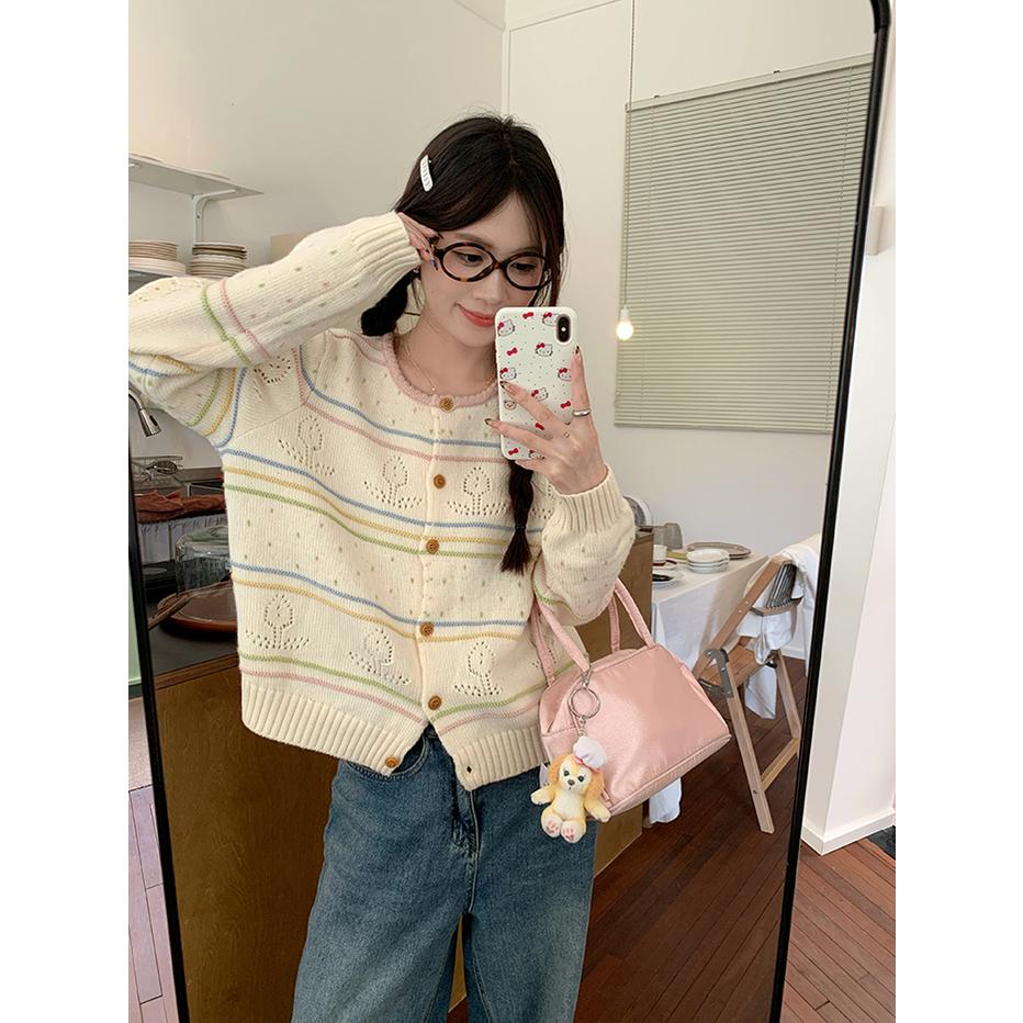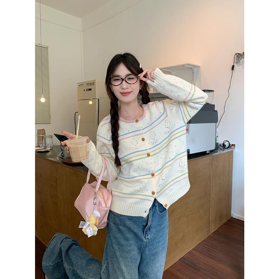 冬装小矮个子150cm显高女装加小码XXXS条纹镂空针织毛衣开衫外套