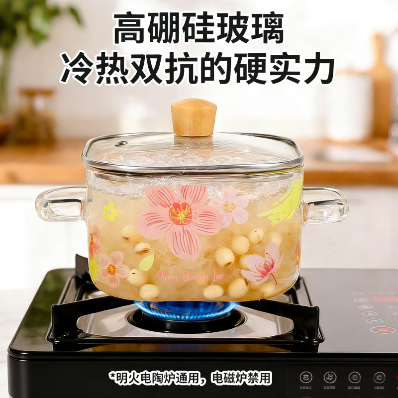 高硼硅玻璃炖锅双耳设计花朵图案带盖汤煲高颜值复古耐高温防爆碗
