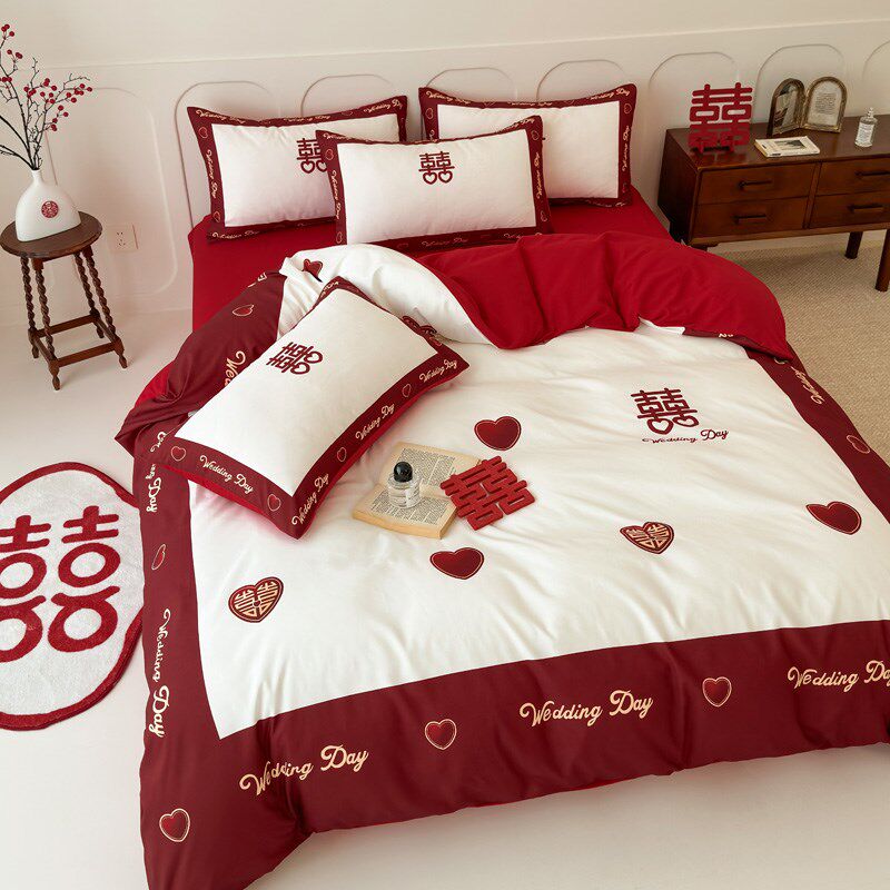 轻奢中式婚庆磨毛四件套大红色被套床单高档结婚床上用品双人喜被