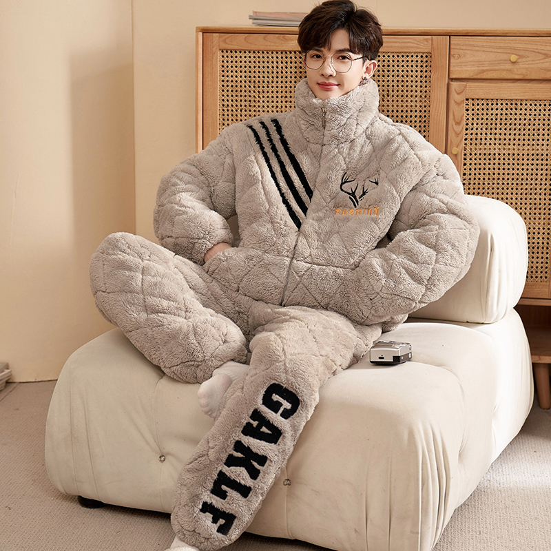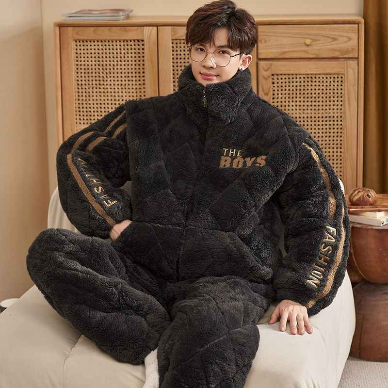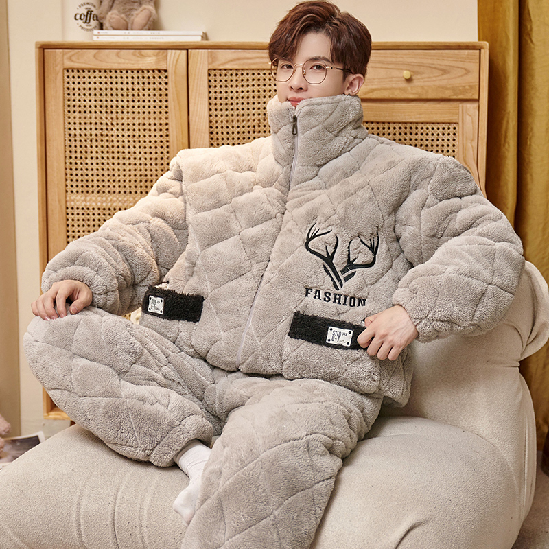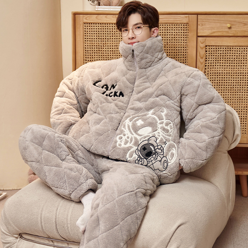 珊瑚绒睡衣男款冬季三层夹棉袄加厚加绒冬天法兰绒男士家居服冬款