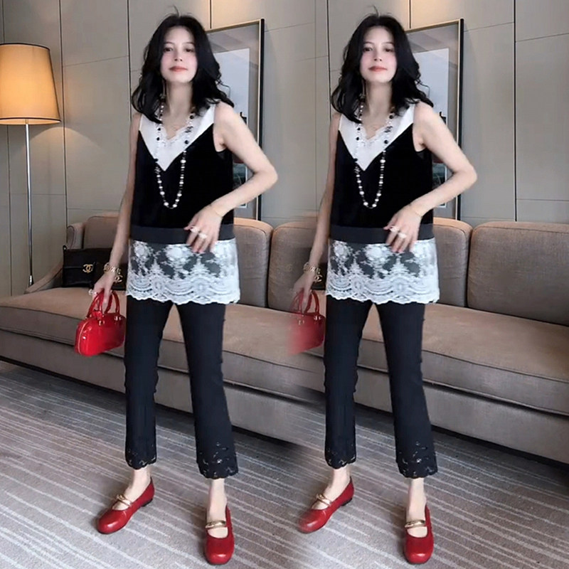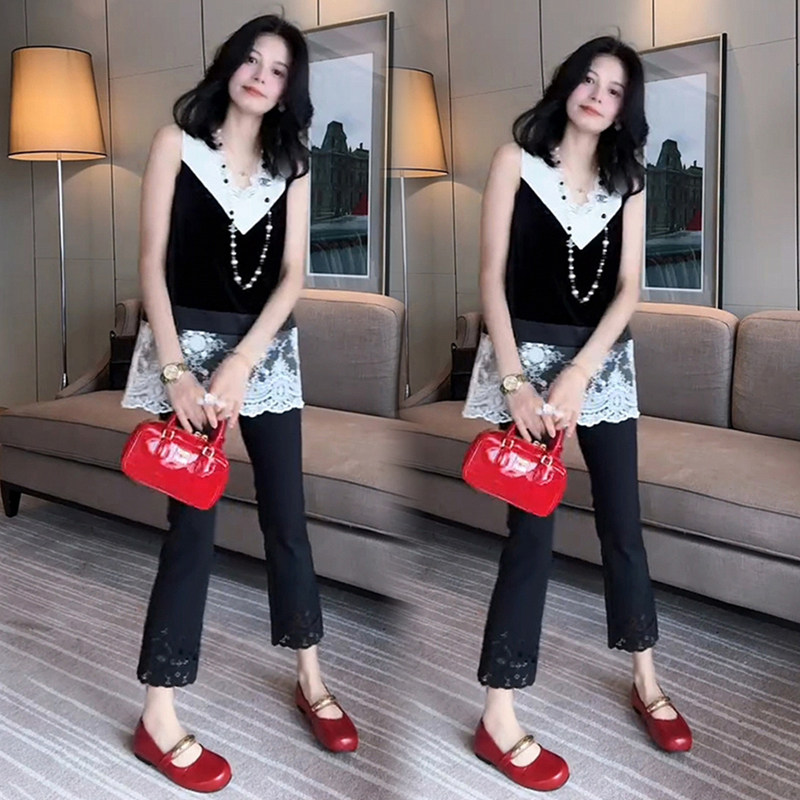 欧货蕾丝拼接丝绒吊带背心女2025春季法式设计感小众显瘦无袖上衣