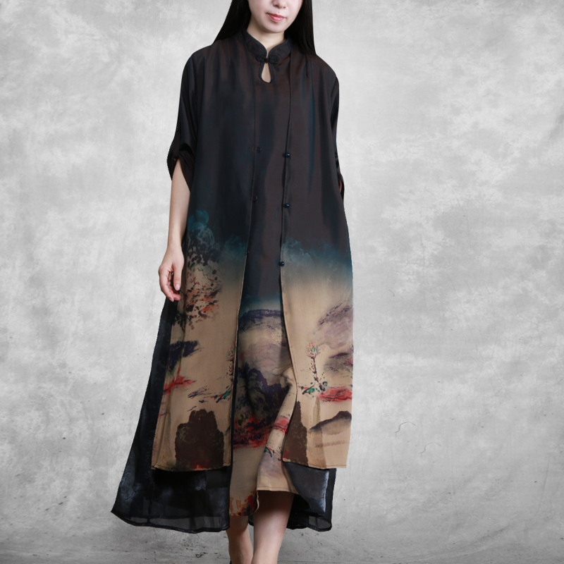 兮风原创设计复古民族风真丝缎两件套春夏文艺长开衫云丝缎连衣裙