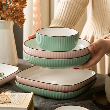 家用餐具陶瓷方盘子典雅蓝圆盘子套装碗盘简约风青粉色菜盘釉下彩