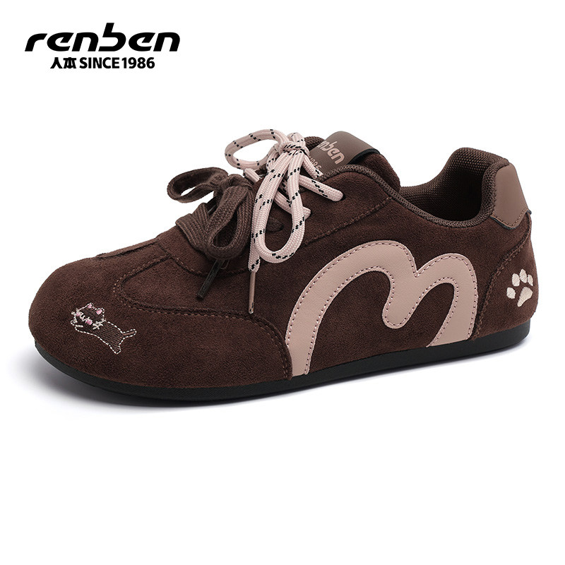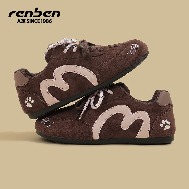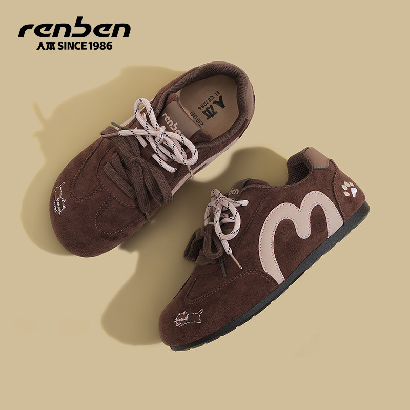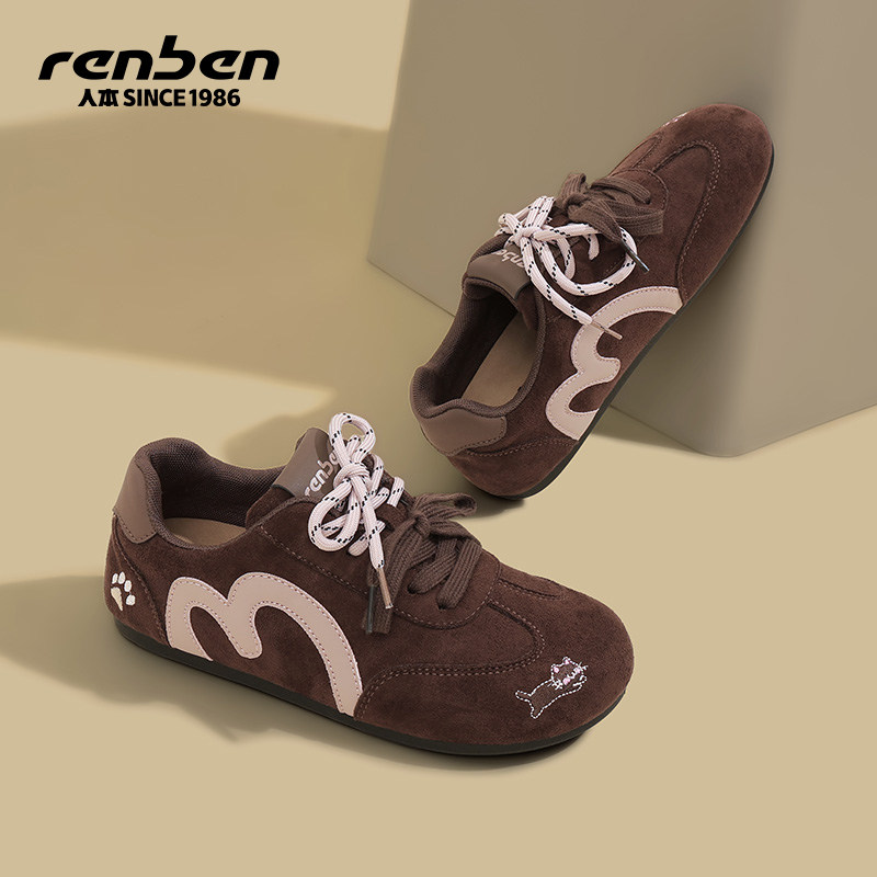 人本棕色德训鞋女2025冬季新款平底内增高学生运动轻便复古赛车鞋