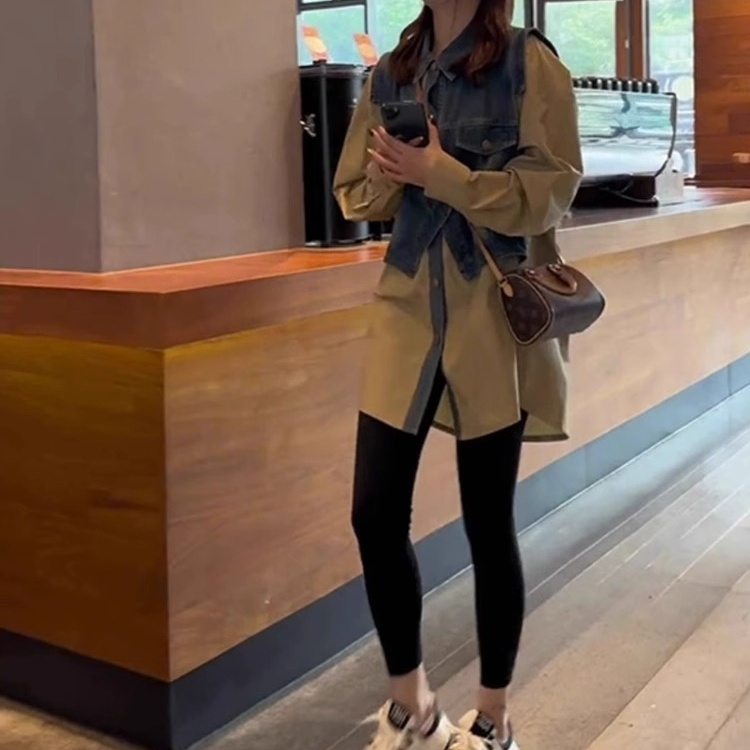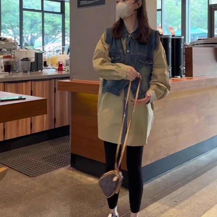 2025春秋新款大码宽松牛仔马甲拼接假两件长袖衬衫女小众设计上衣