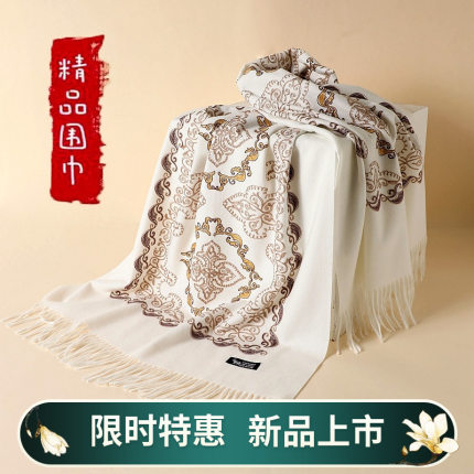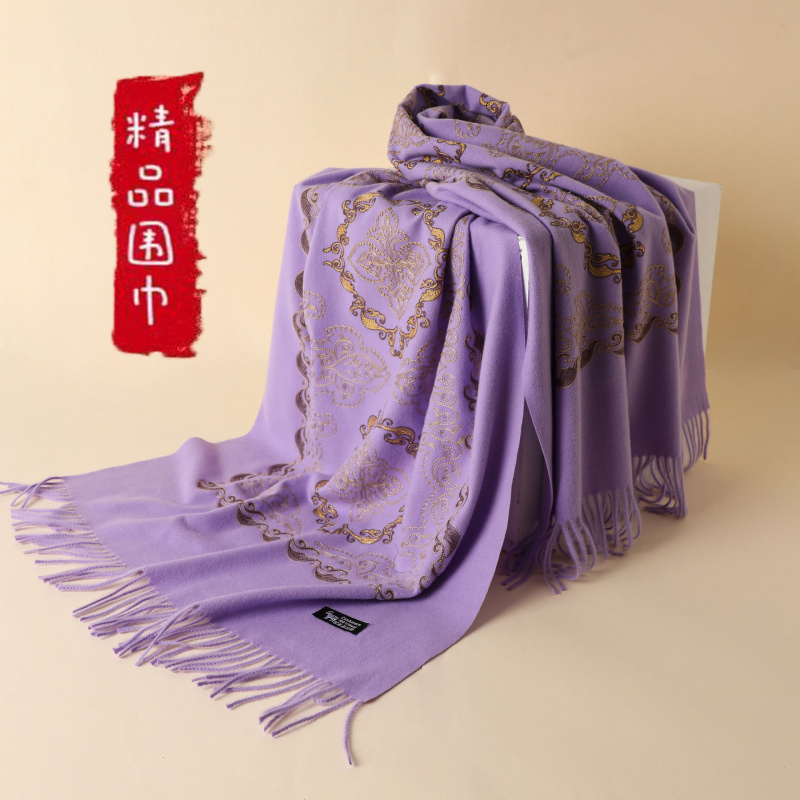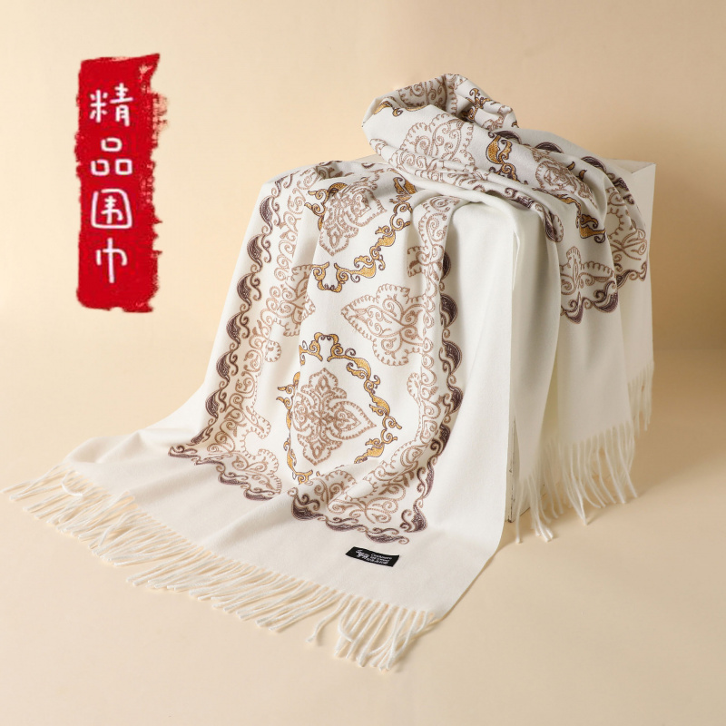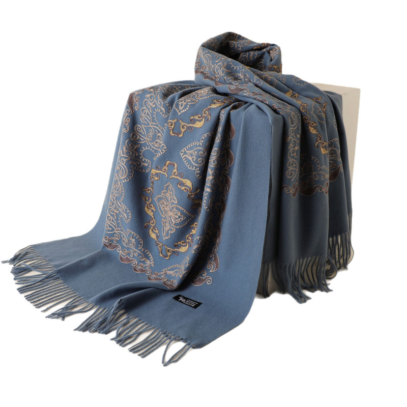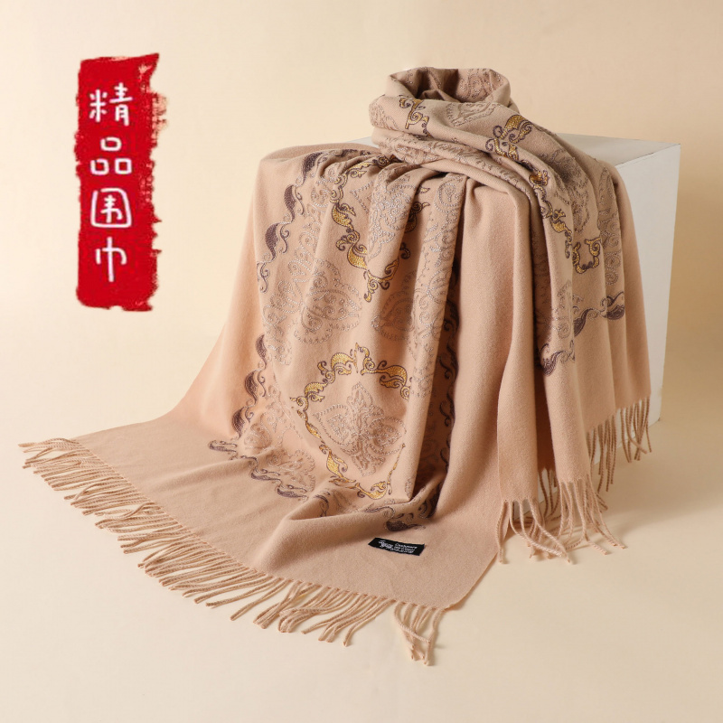 秋冬季仿羊绒菱形刺绣围巾女加厚保暖流苏民族风大红围脖披肩批发