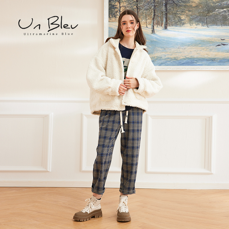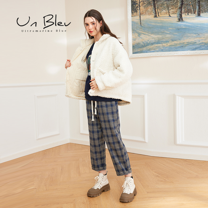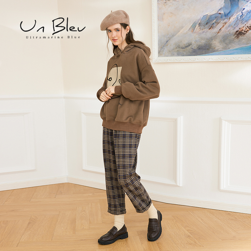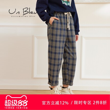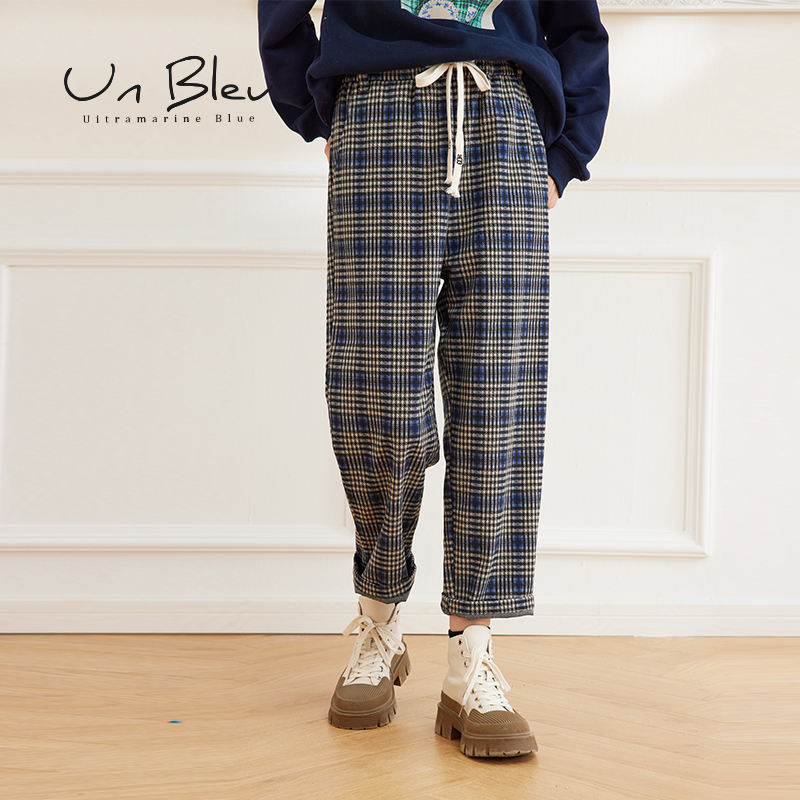 unbleu裤子女格子裤春秋女装新款冬装复古休闲蓝色格纹直筒裤