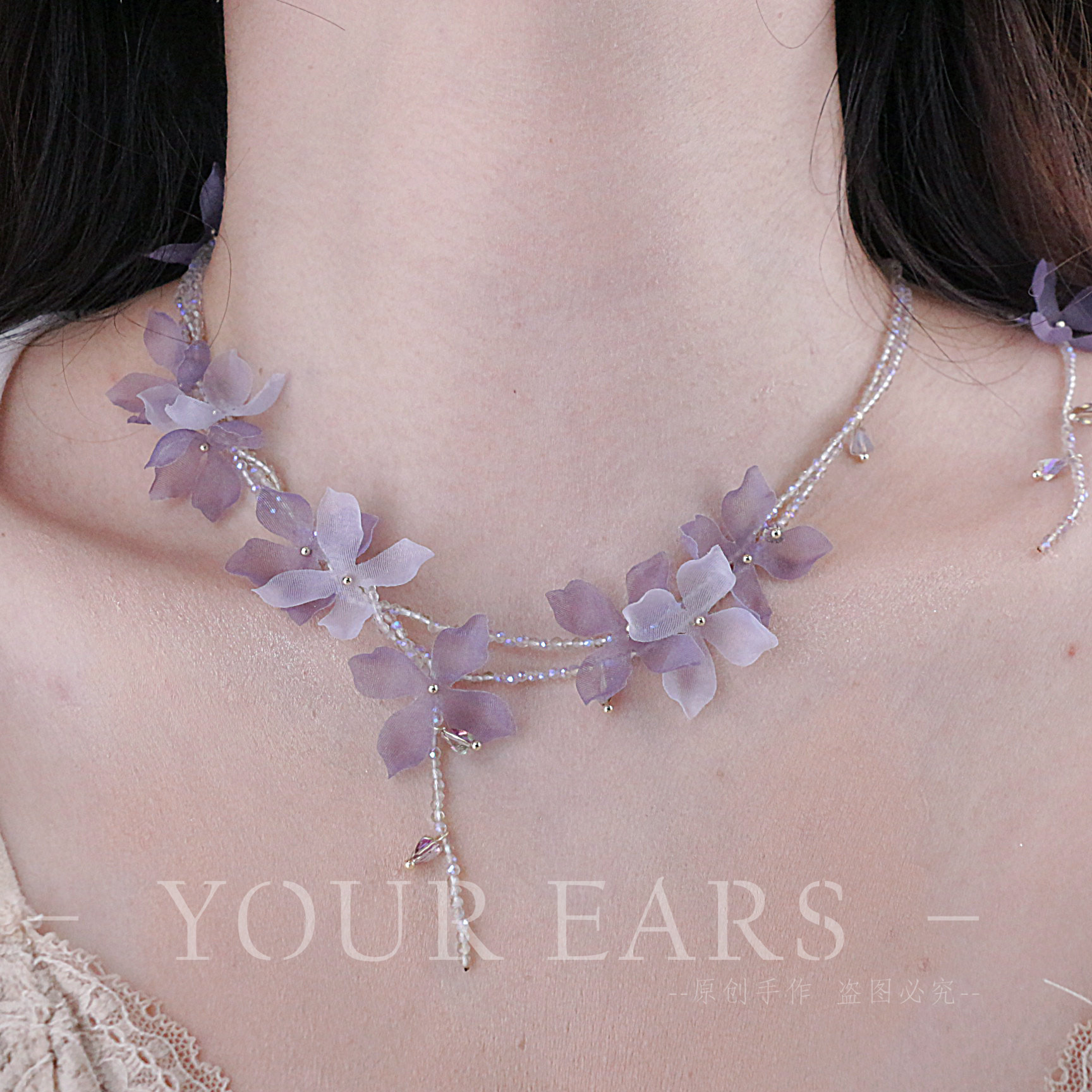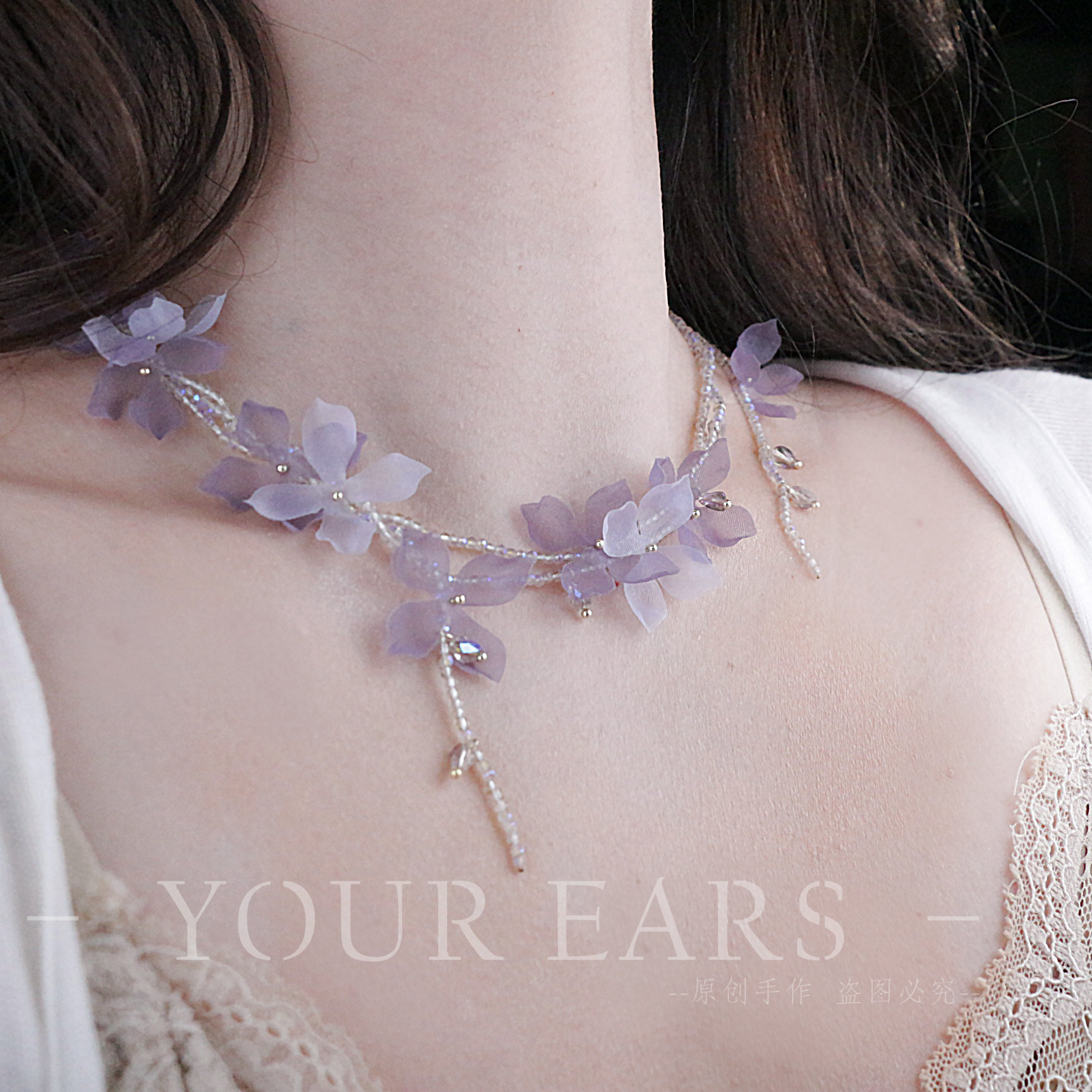 YOUR EARS原创手作甜美紫色花朵玻璃串珠项链高级感锁骨链流苏