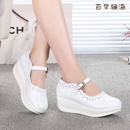 25春夏真皮女圆头浅口平底软底坡跟厚底休闲妈妈单鞋小白鞋护士鞋