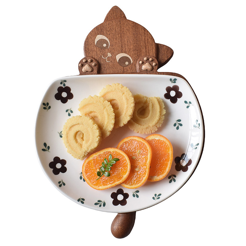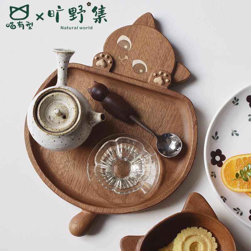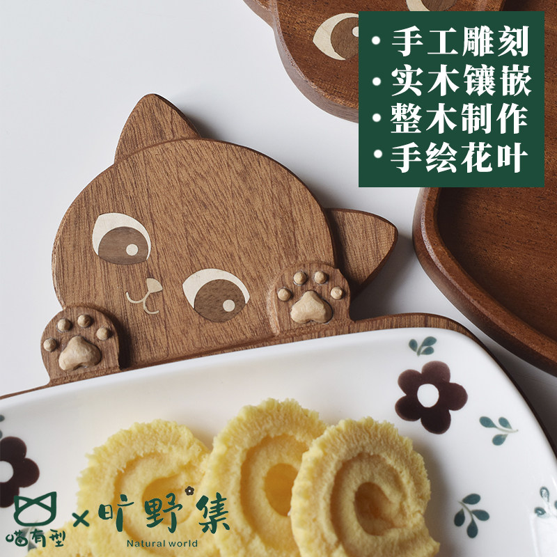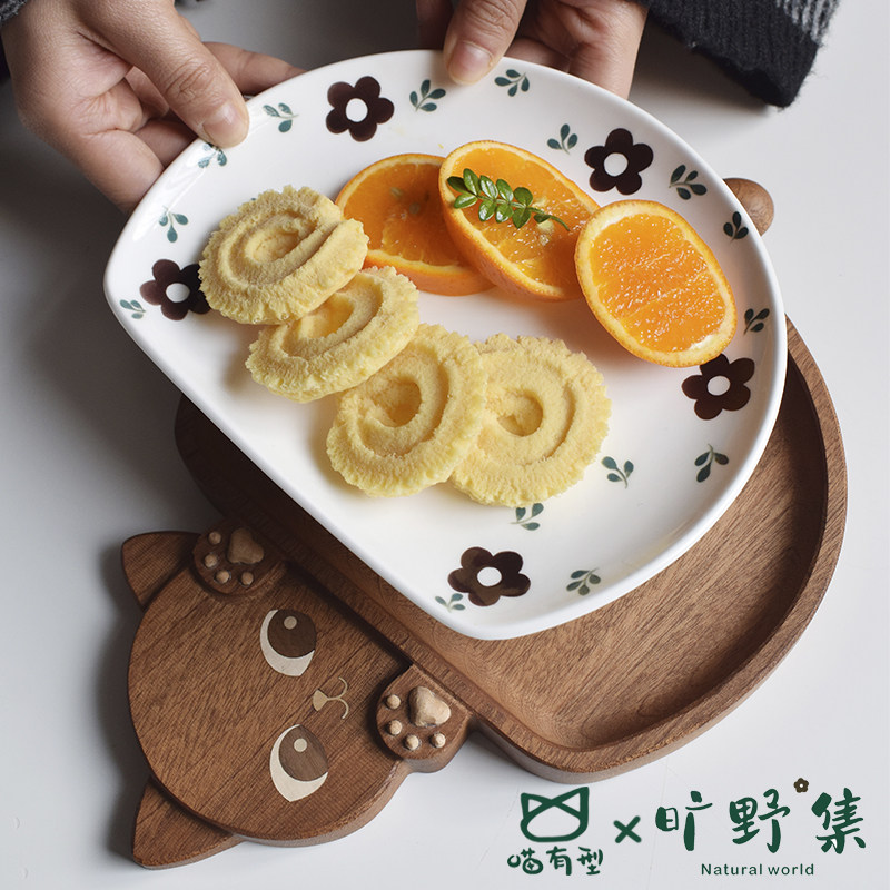 酿秋x喵有型可爱猫咪双盘家用实木花朵陶瓷果盘沙拉早餐盘茶盘子