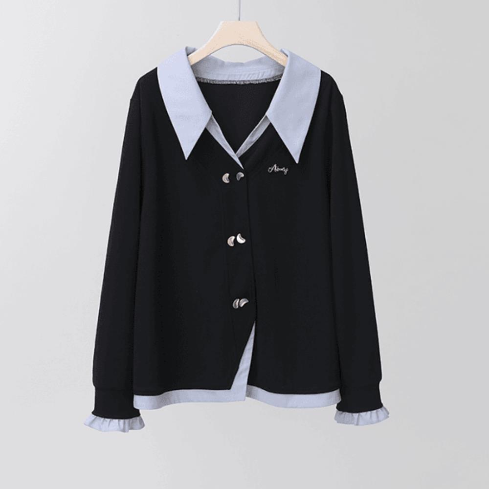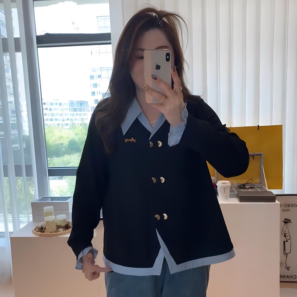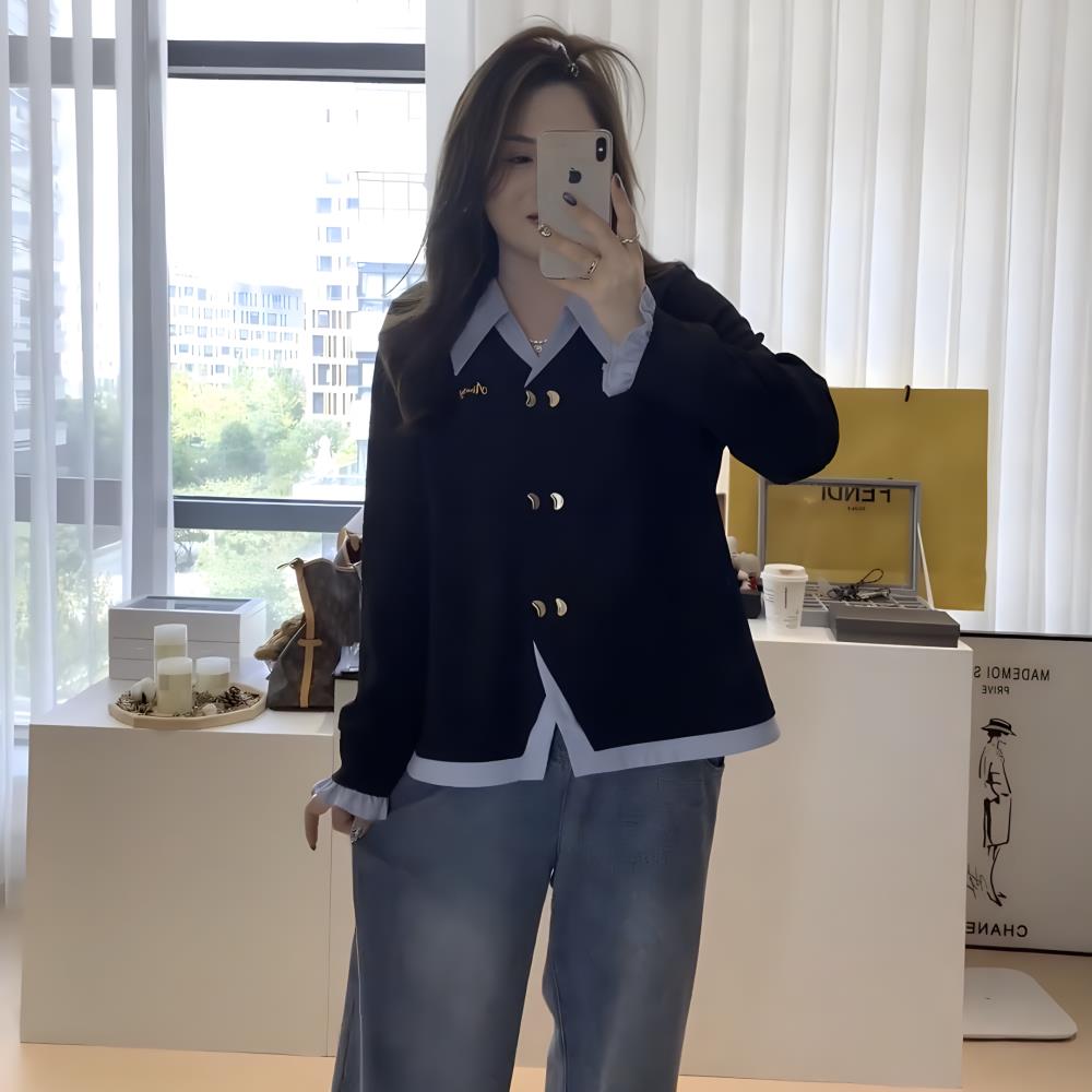 大码女装假两件外套2025新款春装胖mm撞色木耳边长袖开衫别致上衣