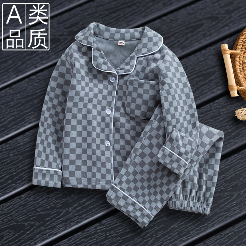 儿童睡衣长袖套装德芙格子秋冬季A类男童女童宝宝家居服德绒开衫