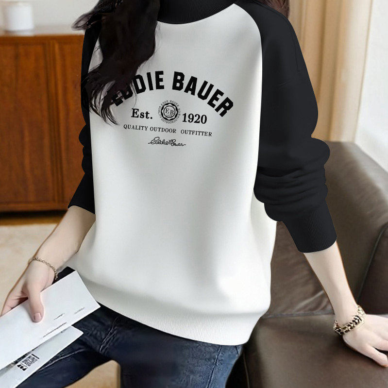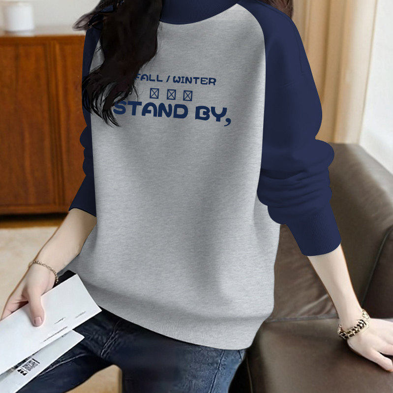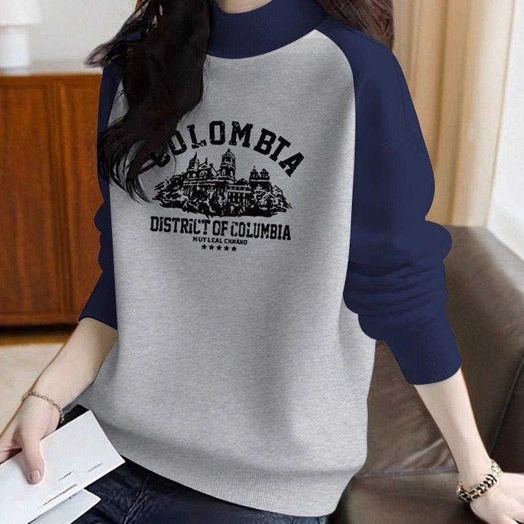 加绒加厚卫衣女秋冬新款宽松韩版设计感撞色插肩袖半高领套头上衣
