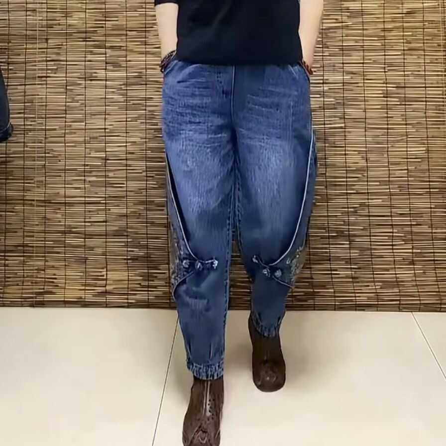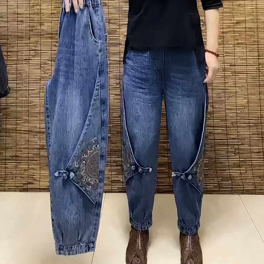 复古秋季新款大码时尚盘扣刺绣牛仔哈伦裤女洋气百搭高档老爹裤潮