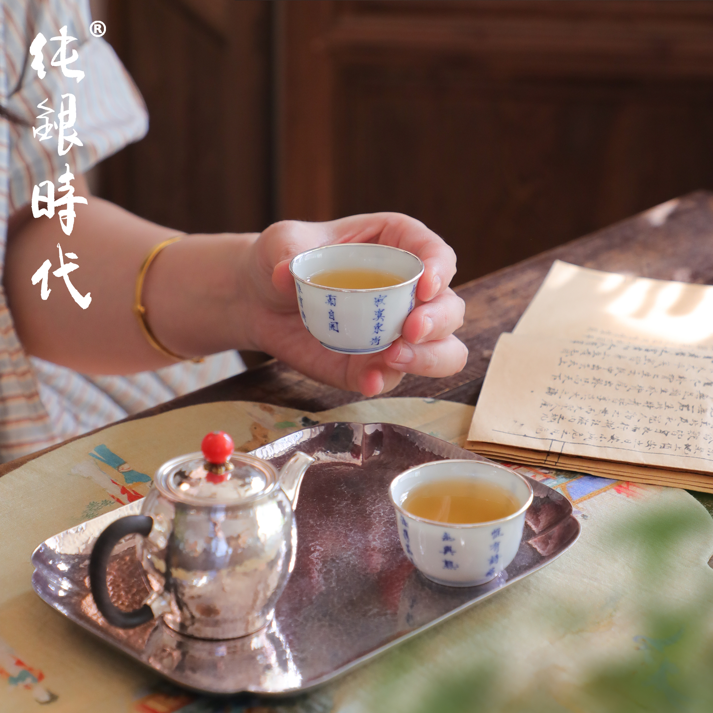 纯银时代 手绘银边青花瓷杯工夫茶杯高端品杯陶瓷茶杯主人杯30ml