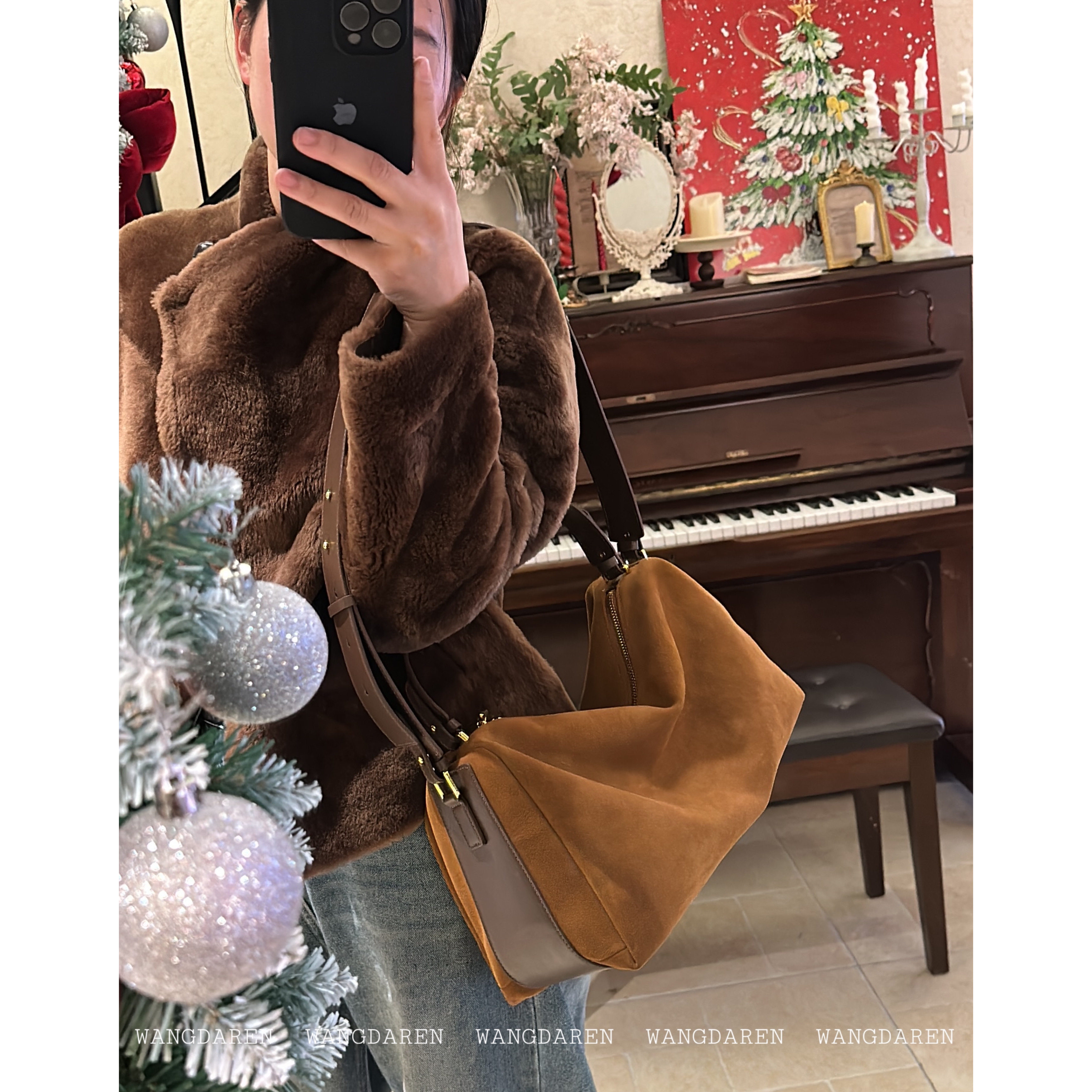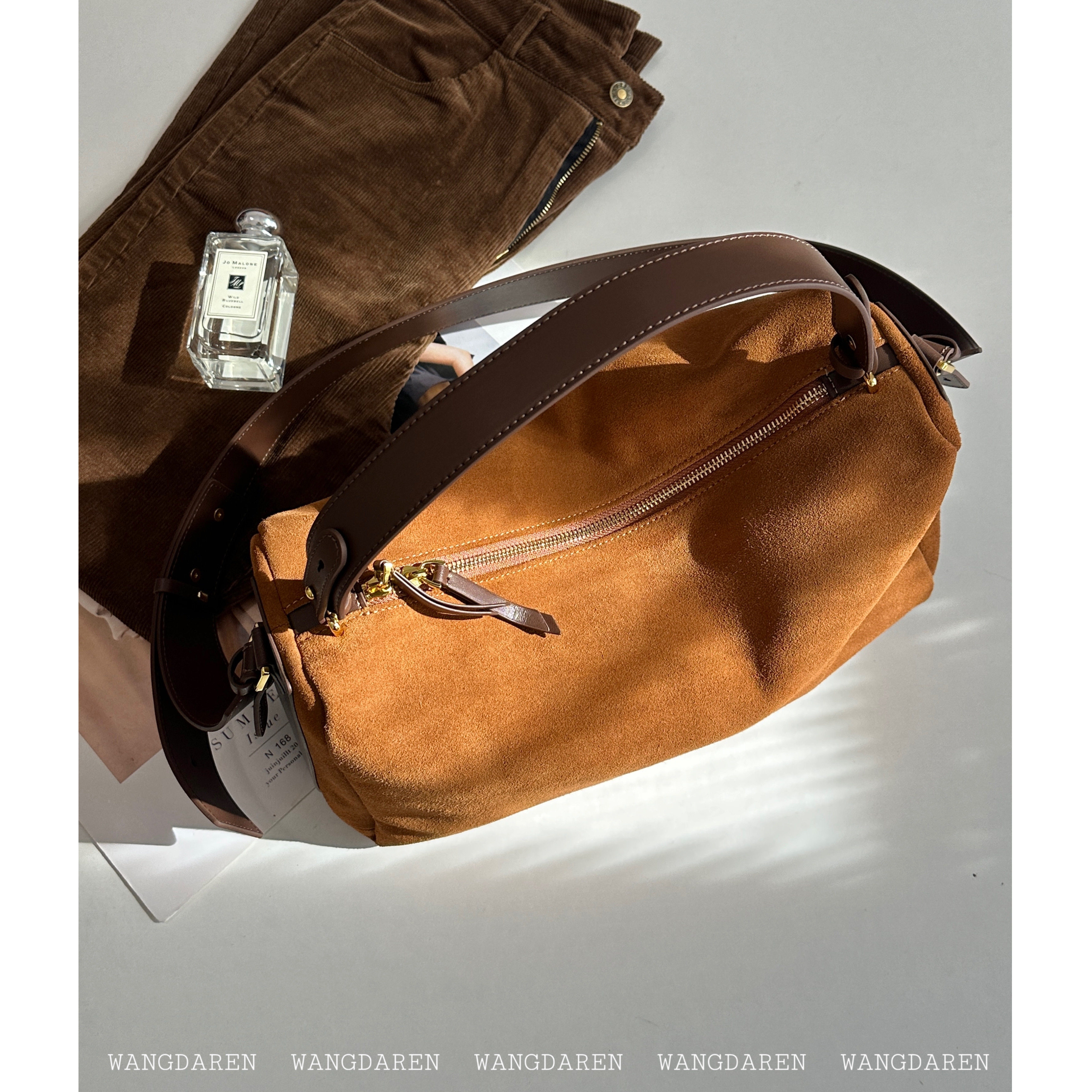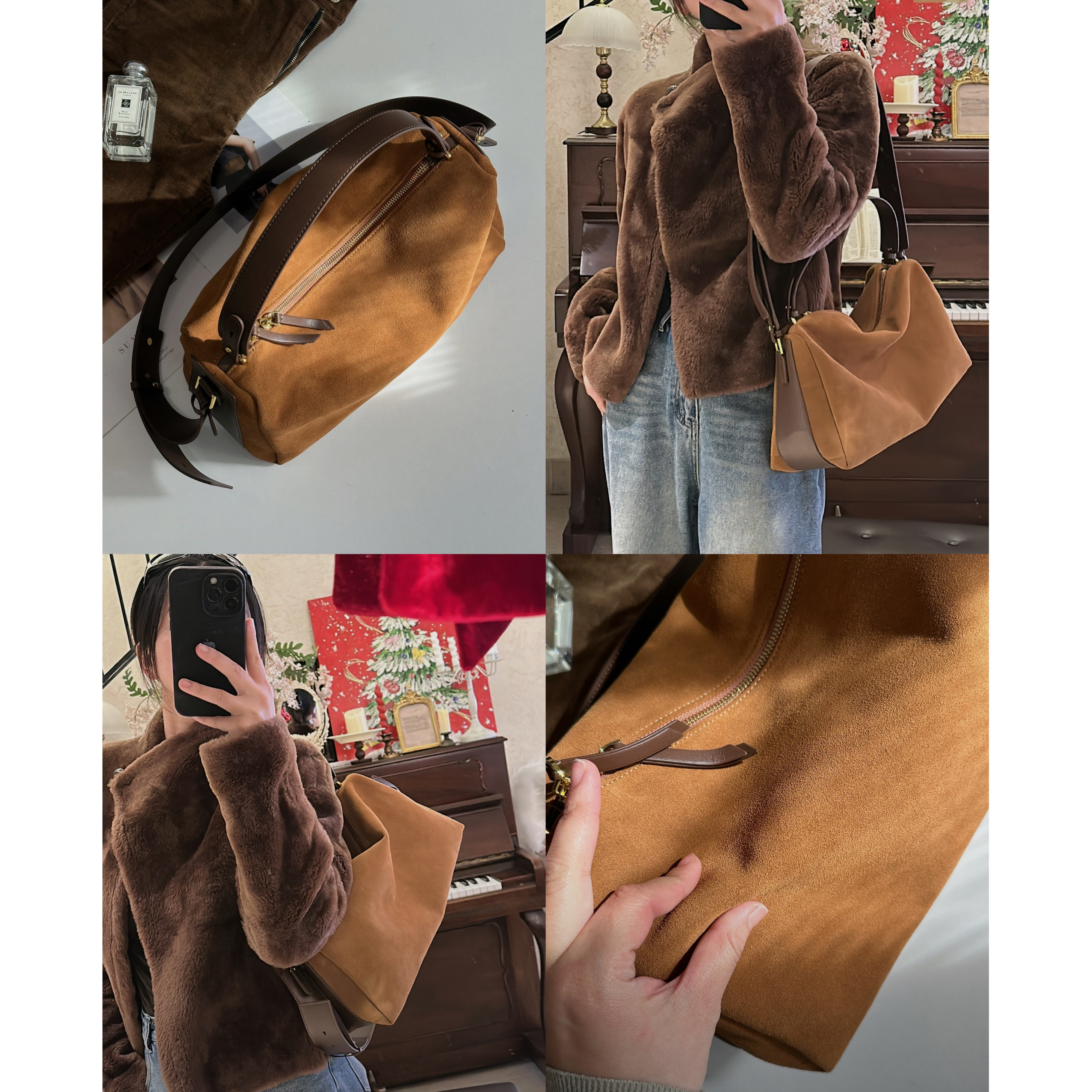 小牛皮植鞣磨砂皮枕头包美拉德复古托特包拼接波士顿包女简约高级