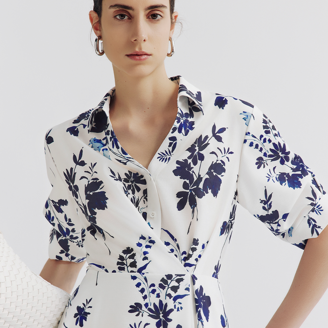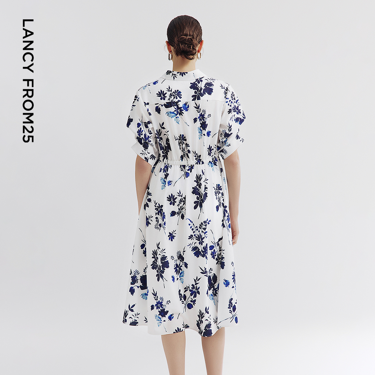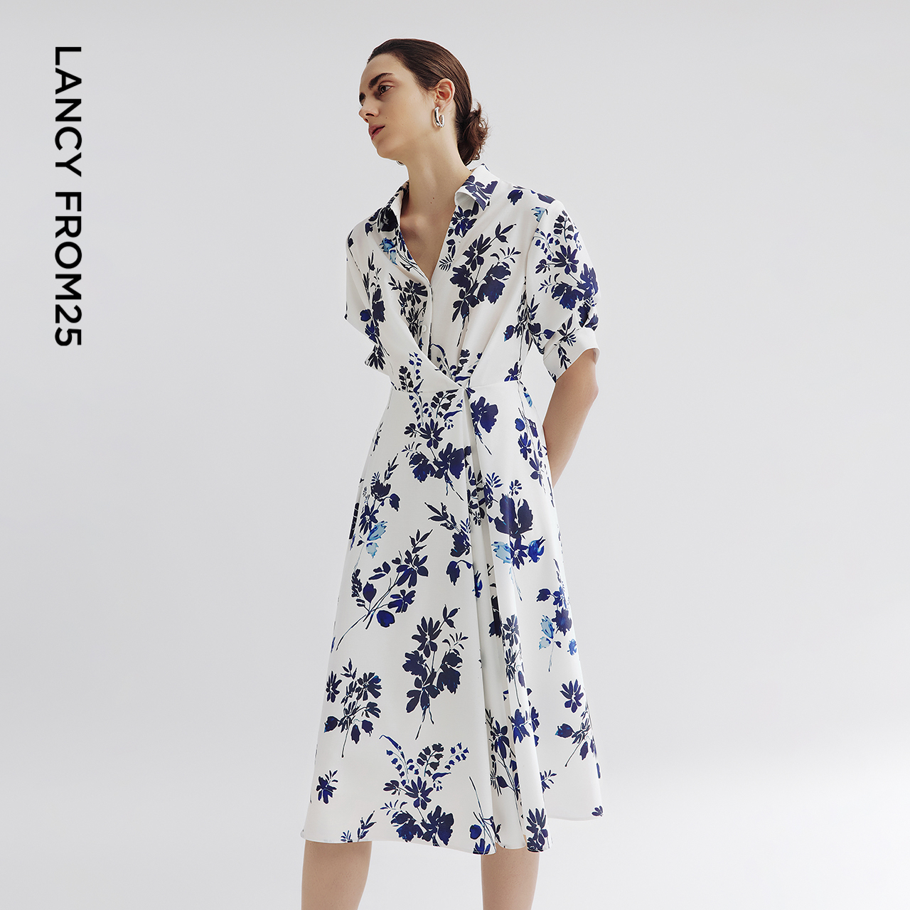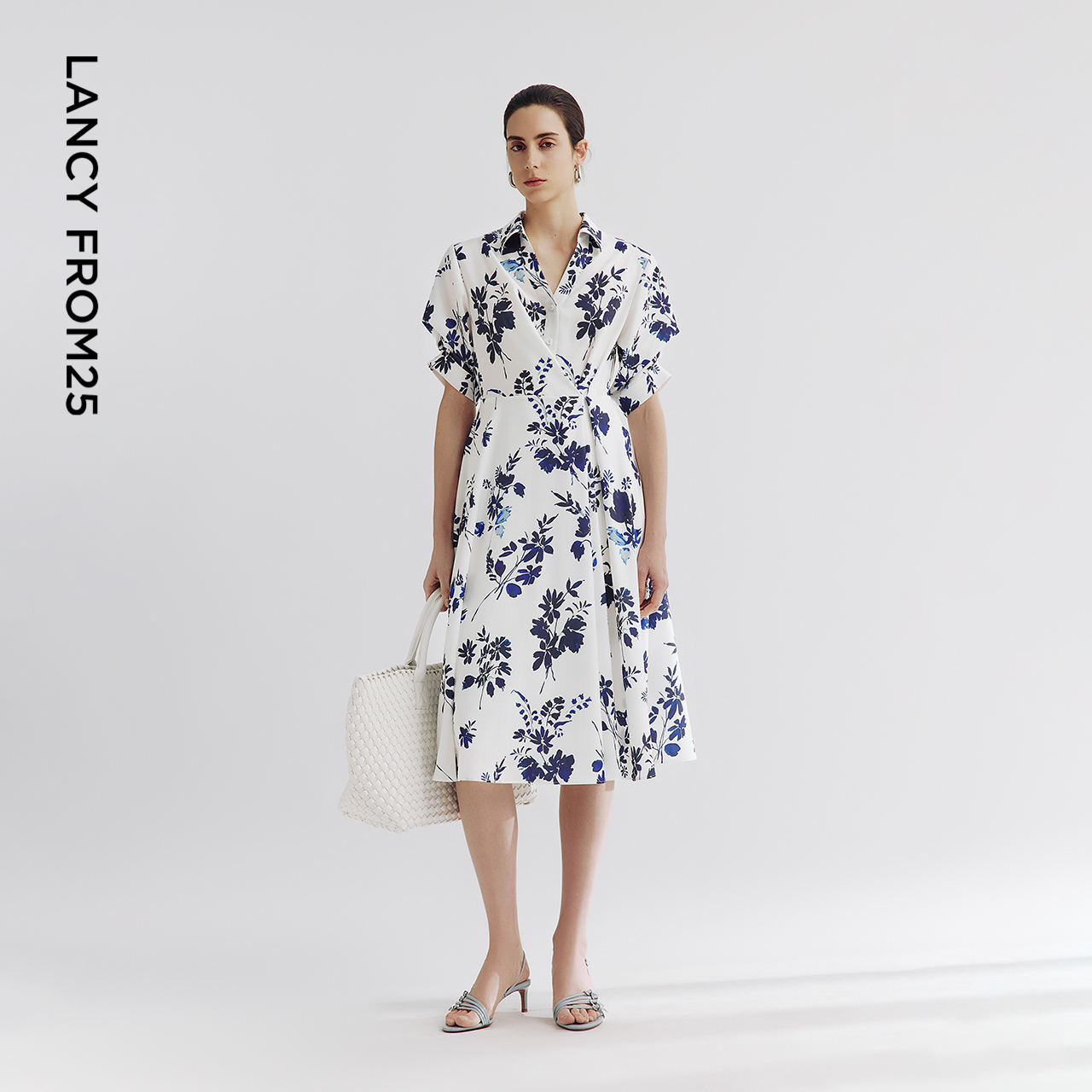 朗姿印花衬衫连衣裙收腰高级感气质a字中长碎花裙2025年夏季新款