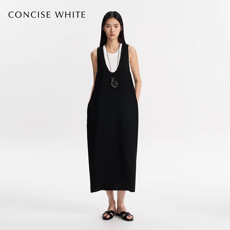 CONCISE-WHITE简白女士简约无袖拼色两件套长款连衣裙 301257