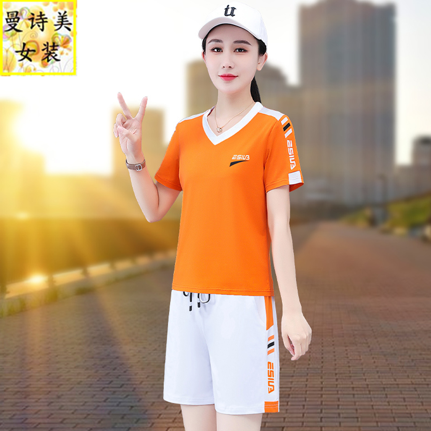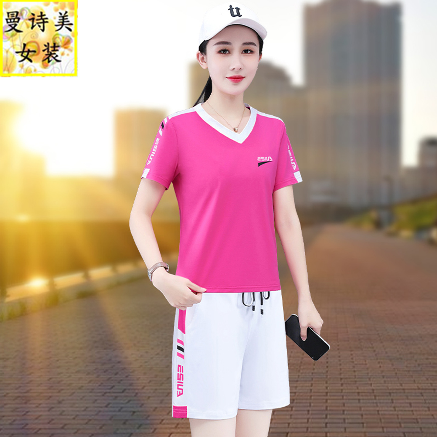 纯棉V领跳舞运动服套装女2025夏季时尚洋气宽松跑步广场舞两件套
