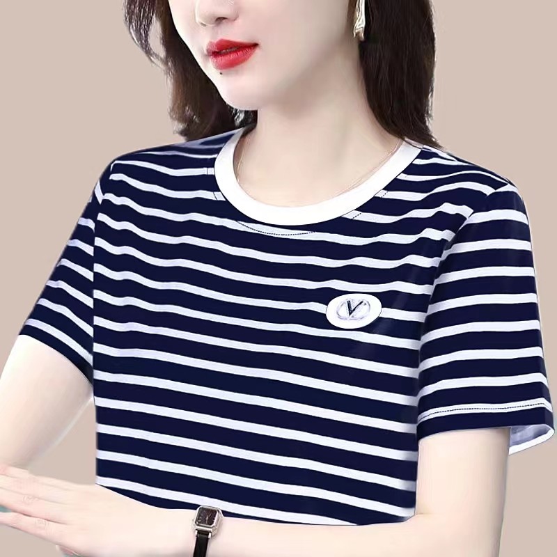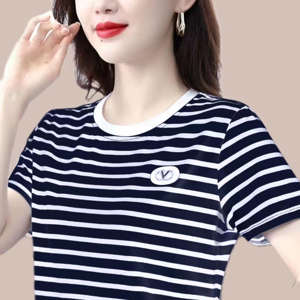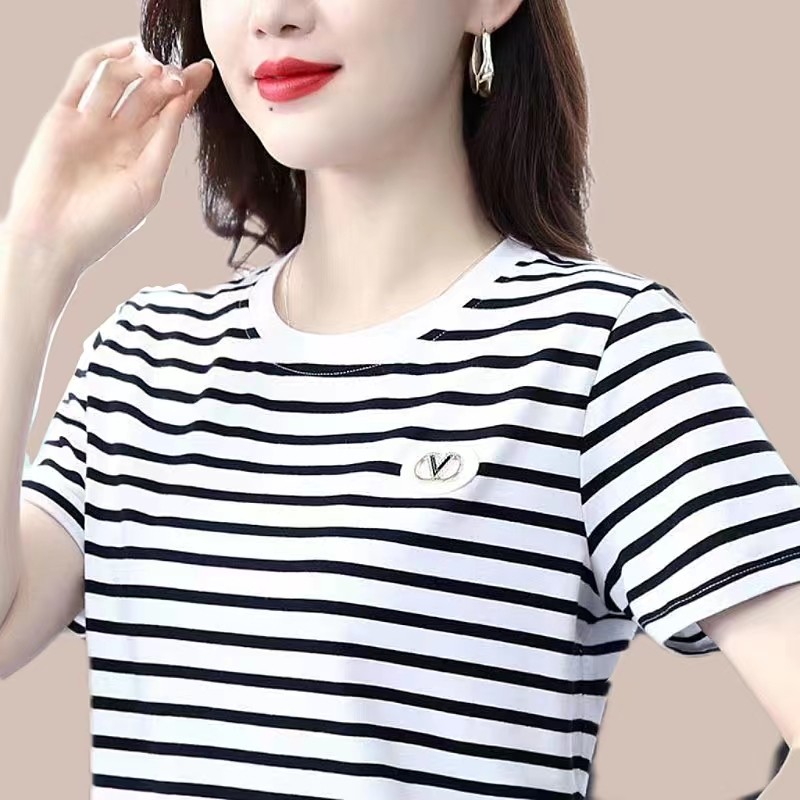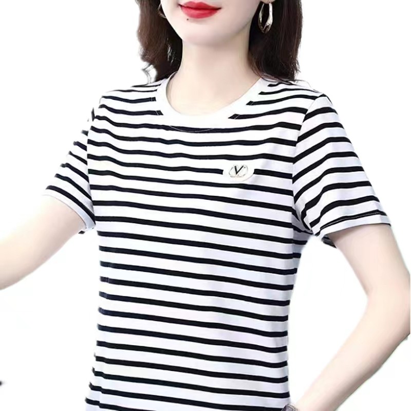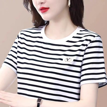 【95棉】黑白横条纹短袖t恤女士纯棉2025夏季新款圆领中年妈妈休