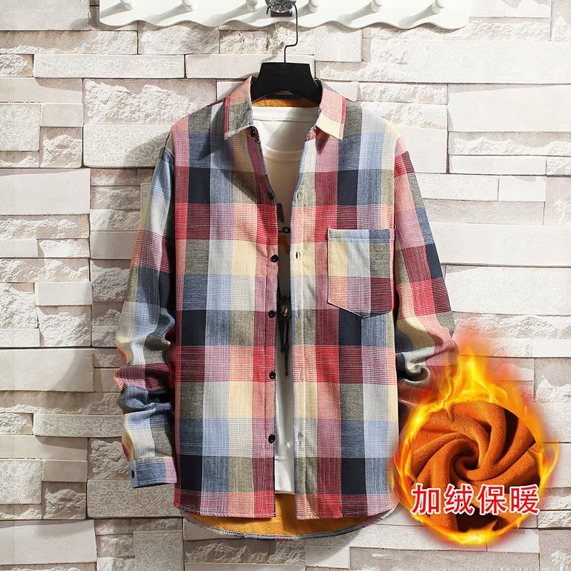 秋冬季保暖长袖格子衬衫男款潮牌休闲衬衣服学生加绒加厚寸衫外套