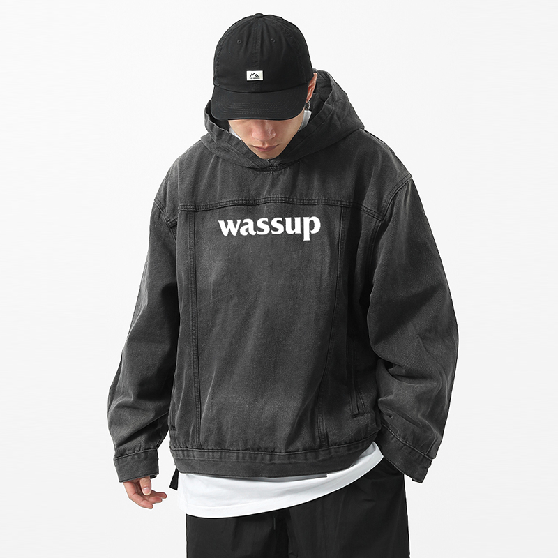 WASSUP美式潮牌高街水洗复古牛仔字母连帽宽松卫衣外套男女上衣秋