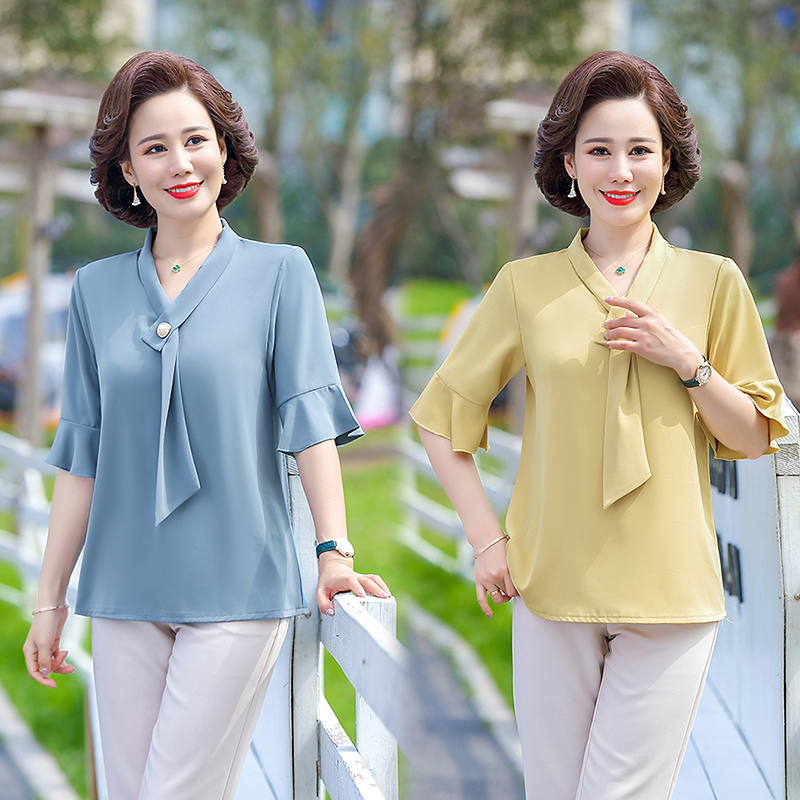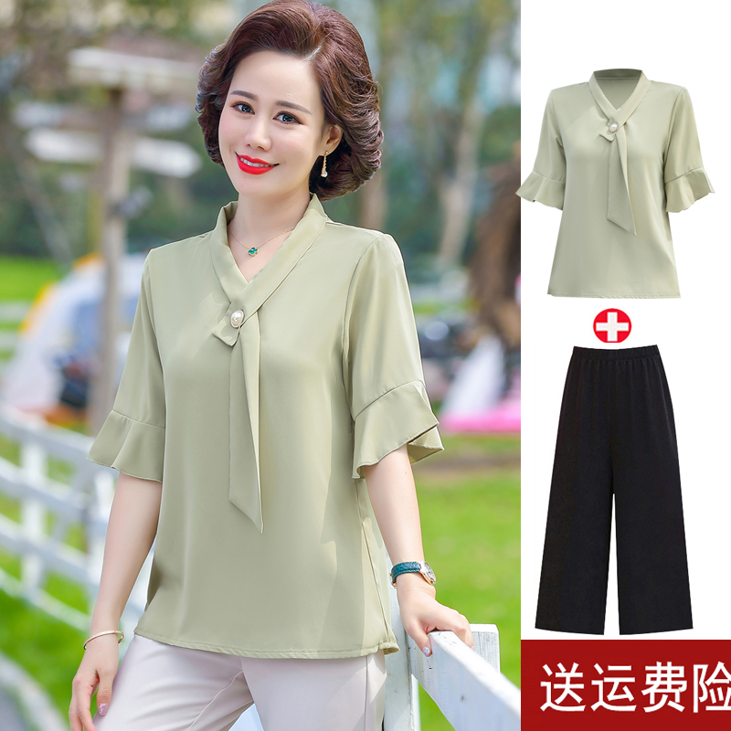 妈妈夏装时尚短袖洋气套装2021新款中老年女装雪纺T恤小衫上衣服