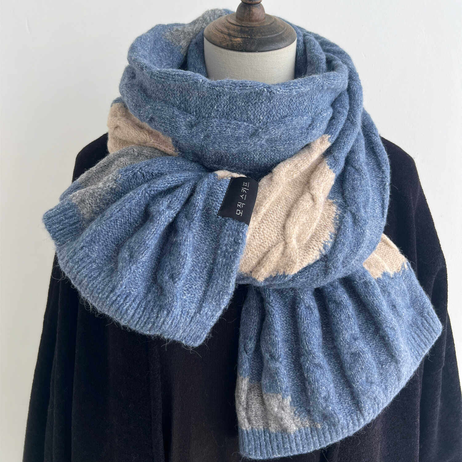 韩系百搭藏青色围巾女冬季含羊毛保暖加厚针织毛线围脖麻花送男生