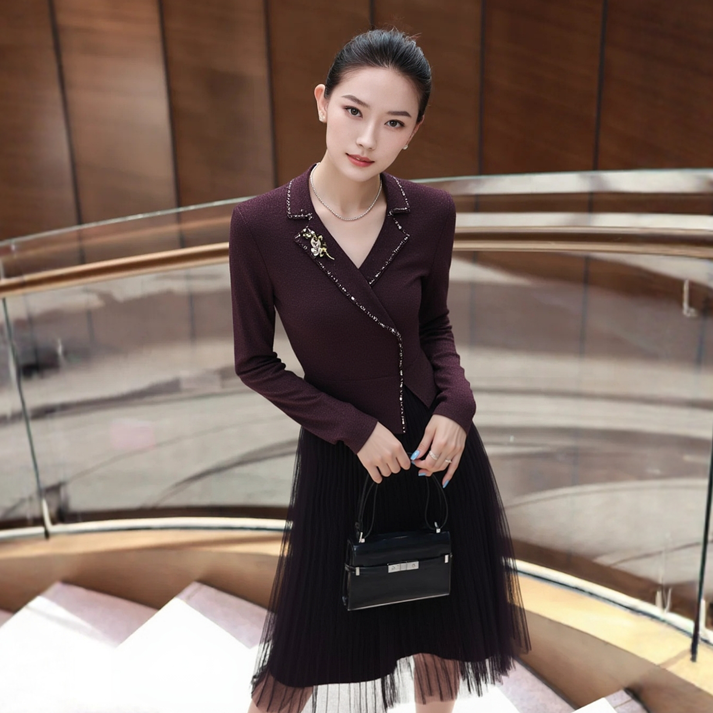 赢智尚秋季红色针织女士连衣裙中长款假两件轻奢小众不撞款裙子