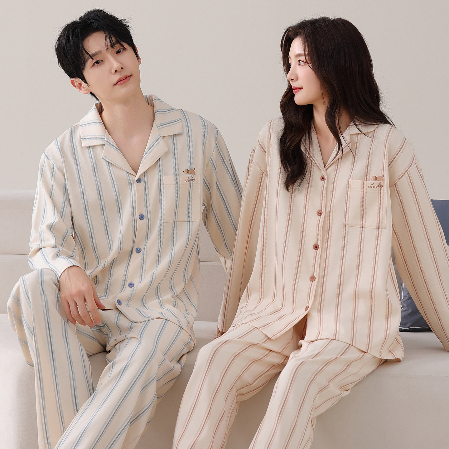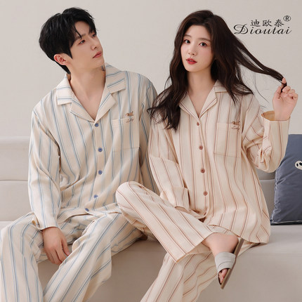 情侣睡衣春秋款高级感纯棉条纹休闲长袖长裤2025新款男女士家居服