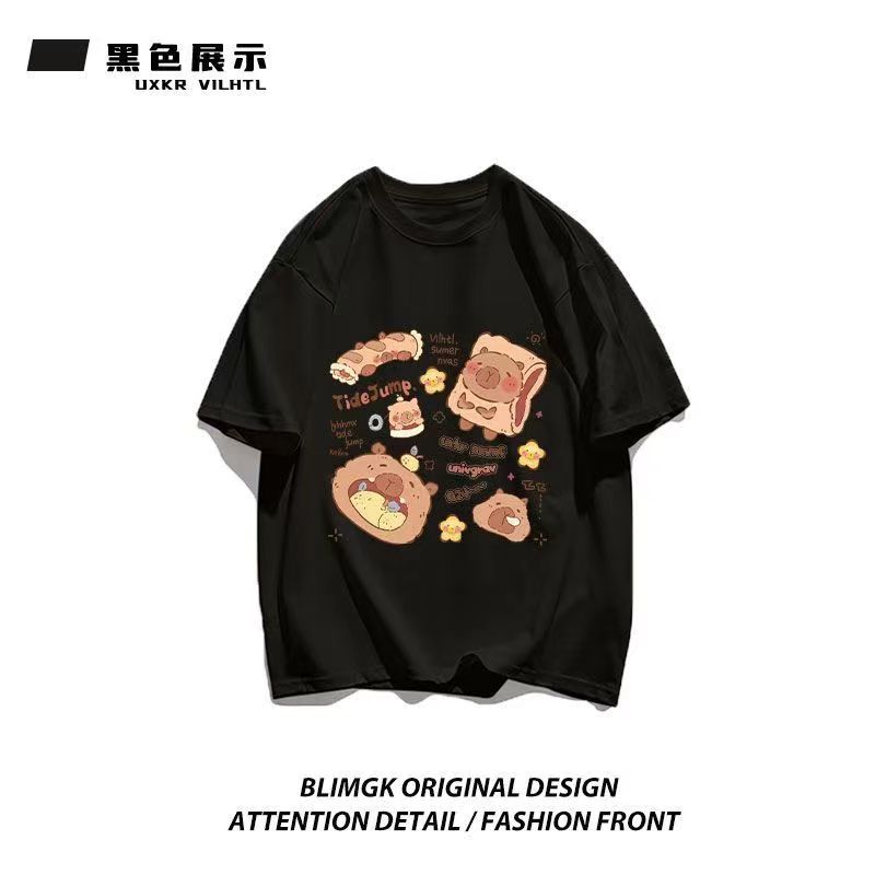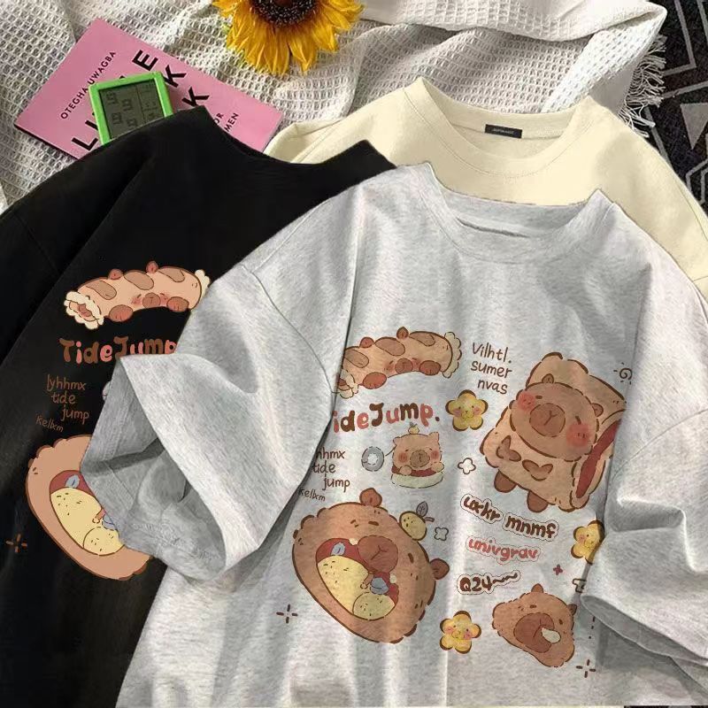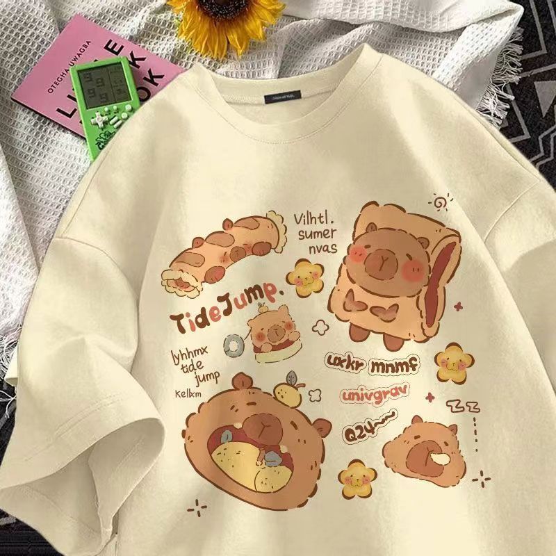 女童夏季新款纯棉短袖t恤奶系洋气面包熊卡通印花中大童半袖上衣