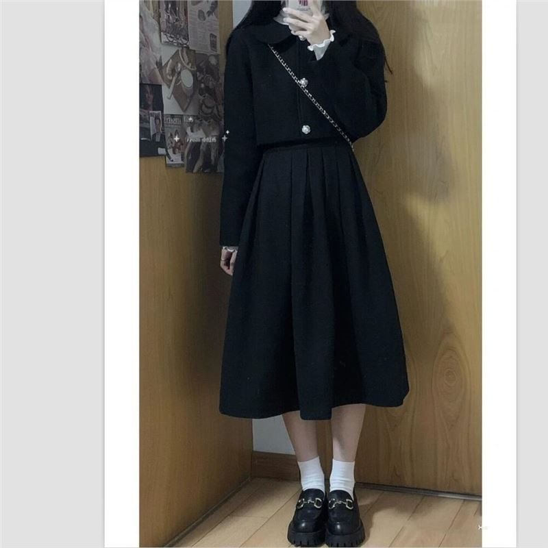 秋冬套装复古小香风毛呢短外套+高腰显瘦百褶半身长裙两件套