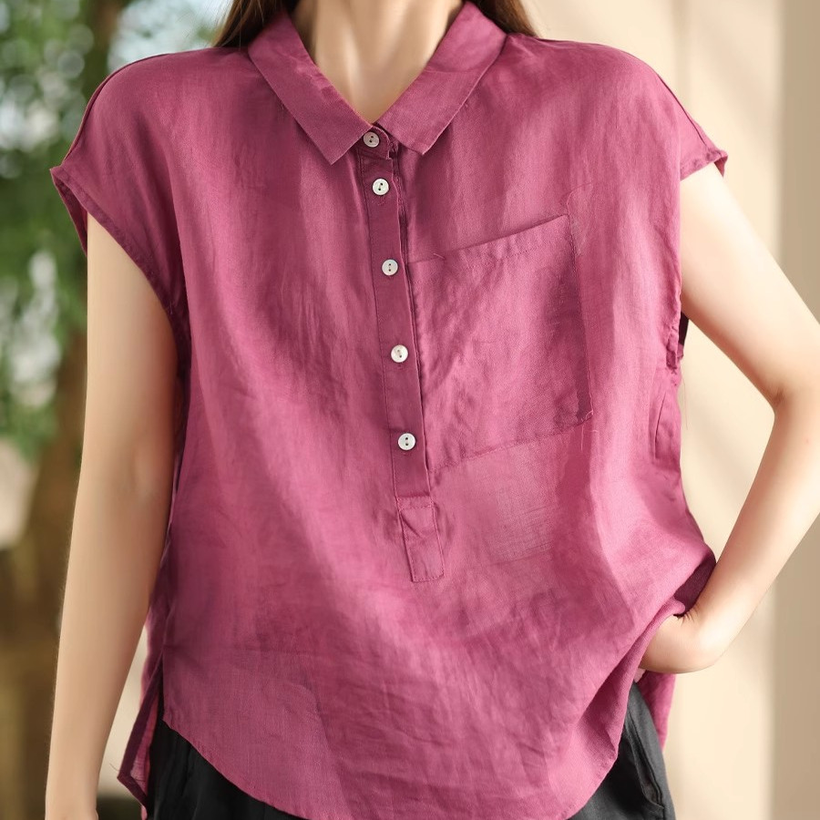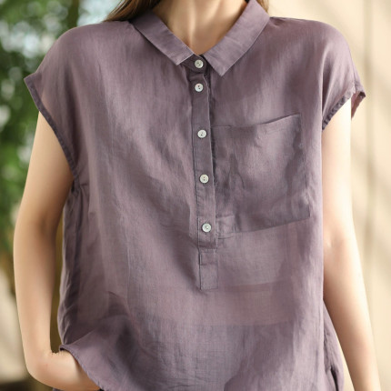 夏季新款复古双支苎麻衬衣女翻领气质衬衫纯色百搭短袖套头衫上衣